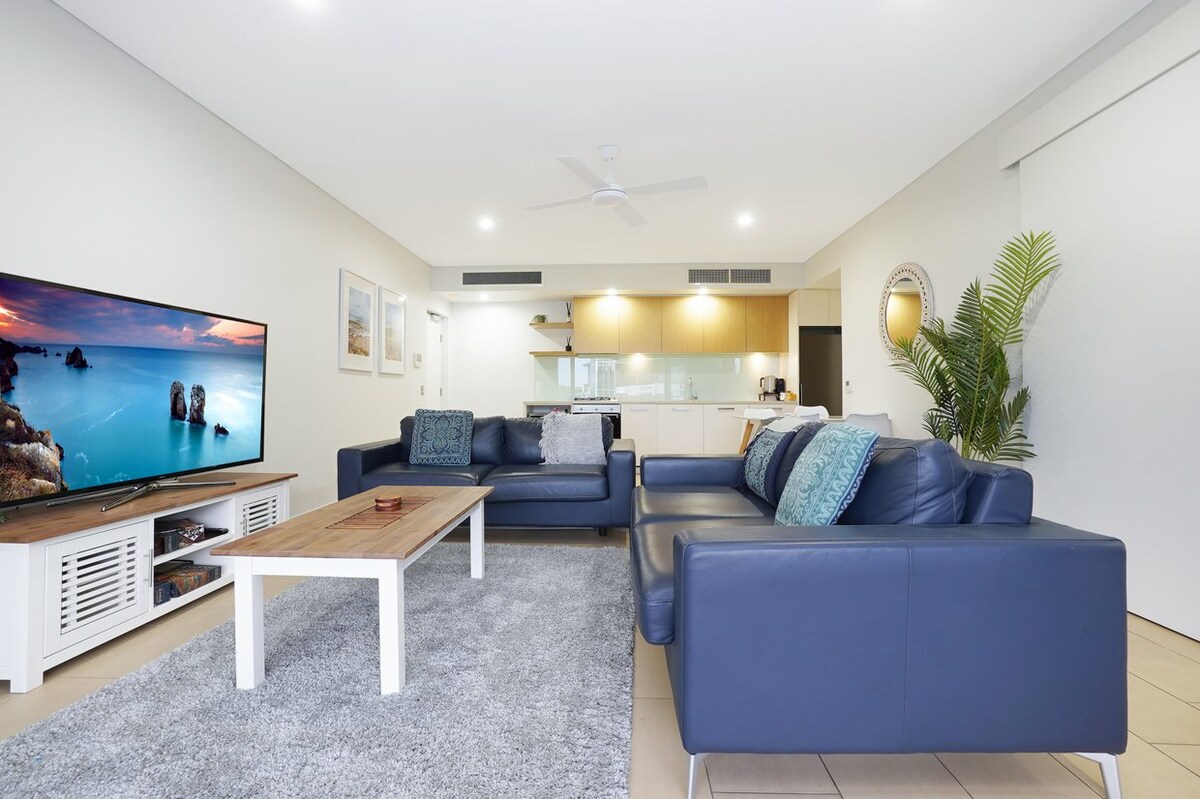 Welcome to La Laguna, a beautifully renovated 1-bedroom, 1-bathroom, 1 car park apartment offering magnificent views of the Darwin Waterfront lagoon and precinct. Located on level 7, this light, tropical, and cosy apartment is the perfect escape. Enjoy the spacious living area, a newly renovated bathroom, and a large balcony with an outdoor dining setting and reading nook chairs. The apartment is fully self-contained with all the modern amenities you need for a relaxing stay.