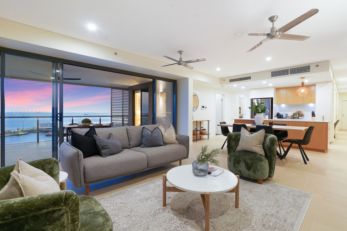 Additional rollaway bed & Portable Cot are available on request ONLY. BEDROOM & LIVING ROOM ( both have sea-views) Beautiful sunrises, amazing sunsets and the calming effects of the water make staying at Sea Renity at Waterfront magical. Our apartment is on the 7th floor, it boasts panoramic views and sensational sunsets over Darwin Harbour and Timor Sea. It offers direct access to the serene Recreation Lagoon and Darwin Wave Pool, both rated in the top ten swimming spots in the NT.