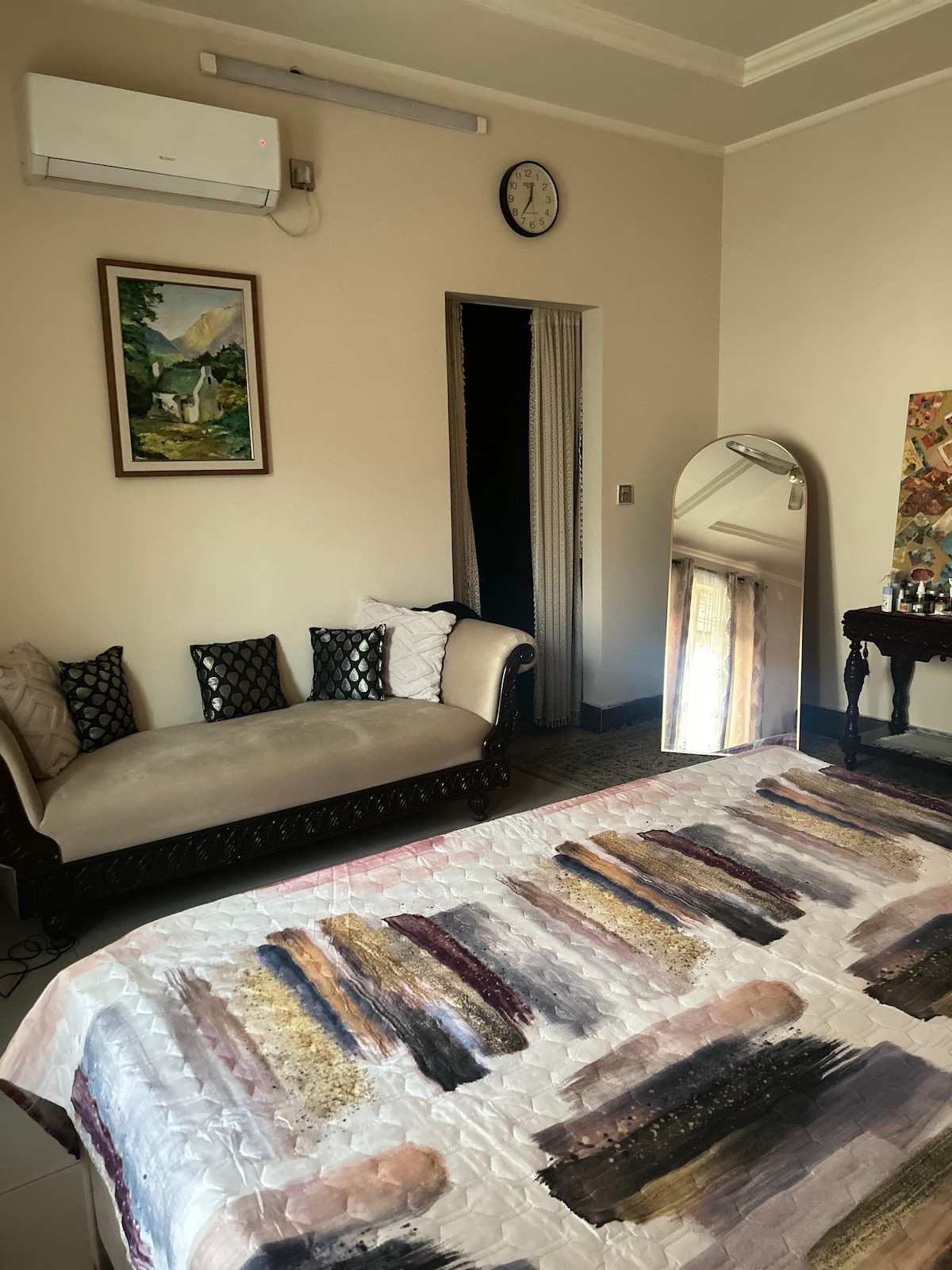 Spacious 1 Kanal luxury home with 6000+ sq. ft. covered area. Features 5 en-suite bedrooms, 2 fully equipped kitchens, large private garden, and cozy TV lounge. Ideal for families or groups seeking comfort and privacy. Housemaid available on request. Peaceful, secure location — perfect for short or long stays. 20 minutes from McDonald, V Mall and other Restaurants.