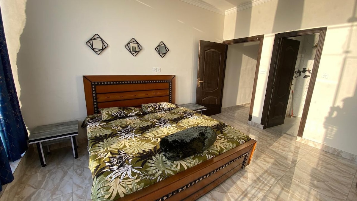 Modern Luxury Home in Sialkot City Housing This luxury villa is perfect for a family or a group of travellers coming to Pakistan. The home is brand new and sparking clean. It has all amenities that a family needs. UPS back up is also available. 4 Bedrooms - 3 King Size Beds – 2 single Beds 4 Bathrooms with standing showers attached to each Bedroom 2 Kitchens with gas stoves Fridge and Microwave 2 Living rooms Smart TV Wifi Sofas, Dining Table Fresh Bedsheets/Linens and Towels Toiletries, Soap