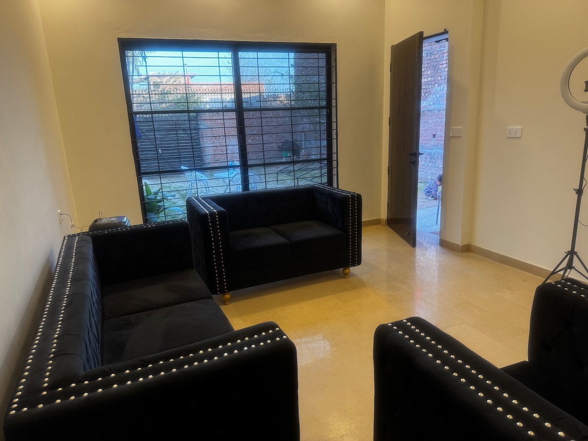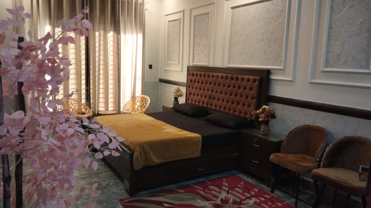 Spacious 1 Kanal luxury home with 6000+ sq. ft. covered area. Features 4 en-suite bedrooms, 2 fully equipped kitchens, large private garden, and cozy TV lounge. Ideal for families or groups seeking comfort and privacy. Housemaid available on request. Peaceful, secure location — perfect for short or long stays. 20 minutes from McDonald, V Mall and other Restaurants.