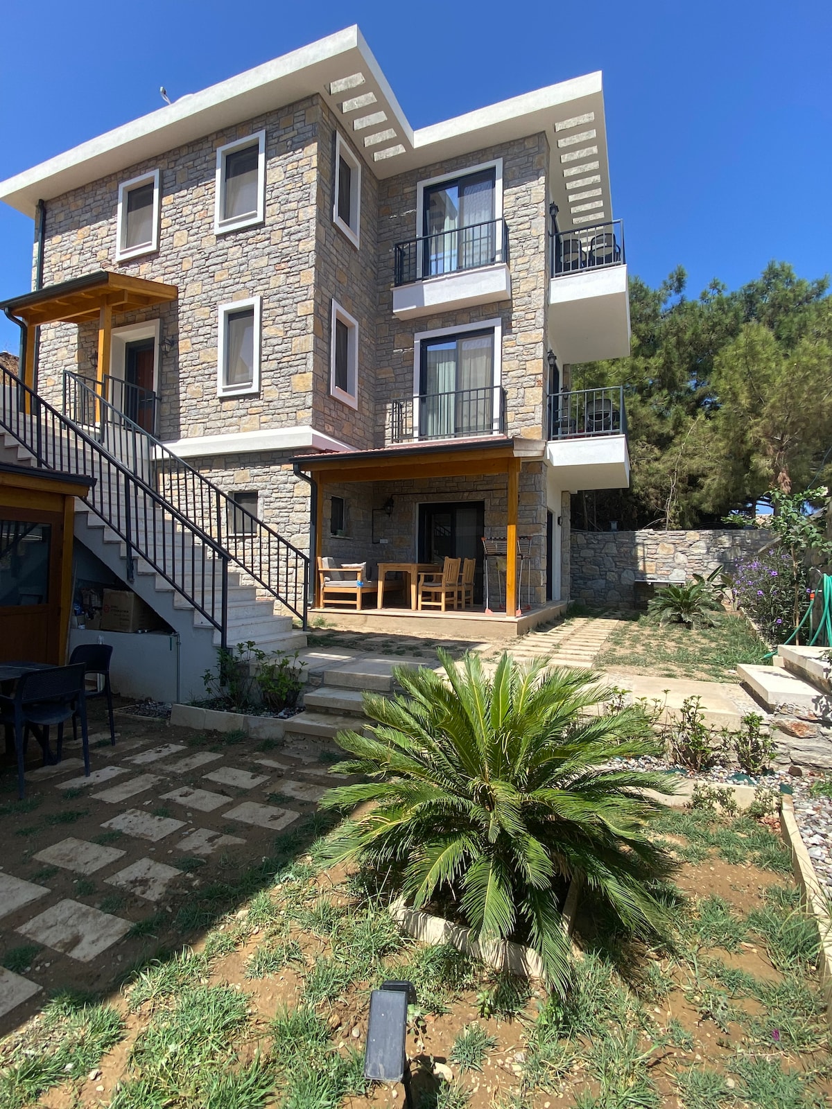 Evimiz lüks mobilyalarla tefriş edilmiştir. Evin aydınlatması modern ve şık abajurlarla desteklenmiştir.Ev denizin tam karşısındadır, Ön balkonu deniz , üst kattaki iki terası dağ manzaralıdır. Evimiz 160 m2 olup, 4 yatak odası, 2adet banyo tuvalete haizdir. Evde 2 adet TV, buzdolabı ve çam. makinası mevcuttur. Ev , asansörlü, jeneratörlü, su depolu ve hidroforlu olup, ayrıca kapalı garajı vardır.Ev, plaja, MIGROS'a , cafe-restoranlara 50-100 metre mesafededir, yat limanı 300 metredir.