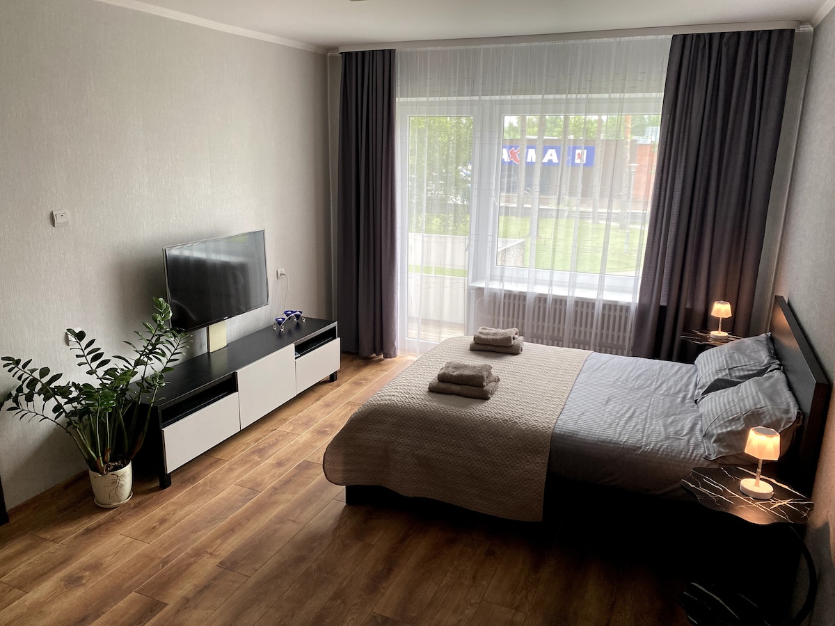 This cozy one-bedroom flat on the first floor is located in the city center and is perfect for 2-4 people. You can feel the countryside atmosphere here, surrounded by a park, with a forest and lake just across the road. The flat features a sunny balcony and is conveniently located near the main city square, shopping center, and grocery stores. It is an ideal place for both business trips and holidays. The apartment is equipped with Wi-Fi, a smart TV, and a washing machine.