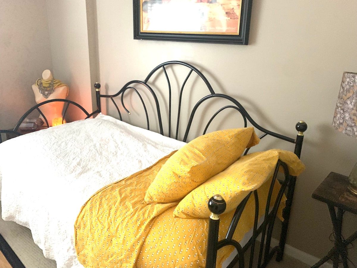 Great Location, in a clean, eclectic art-filled home, comfortable & quiet. Large spacious room with a closet & dresser, seating/lounge area. Dinning & Living room to stretch out and work from home. Close to many restaurants, cafe's, grocery stores. Along with the river front park just a block away you its great for a stroll and fresh air!