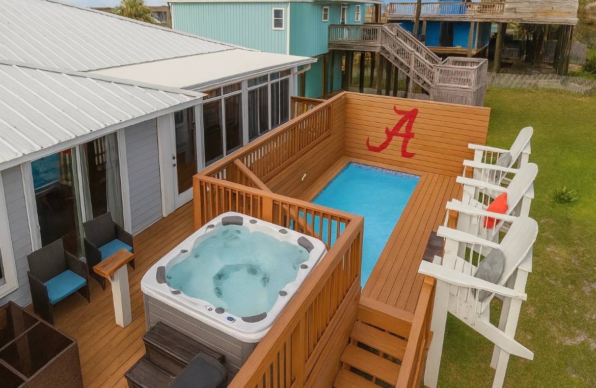 Upscale Modern Beach Decor with a relaxing GULF VIEW. 4 bdrm 3 bath home. Spacious floor plan, vaulted ceiling w/lg fans, steps from the gulf beach. Fully equipped kitchen. Granite counters & large island bar. Kitchen and Dining room eating, Great Room with 65" TV. Two king bdrms en-suite baths, a Queen bdrm, & Bunk Room with 2 twins & 2 fulls. Wide front porch with relaxing rockers faces southwest for stunning beach and sunset views won’t disappoint! Min age: 25 *PET FRIENDLY w/restrictions