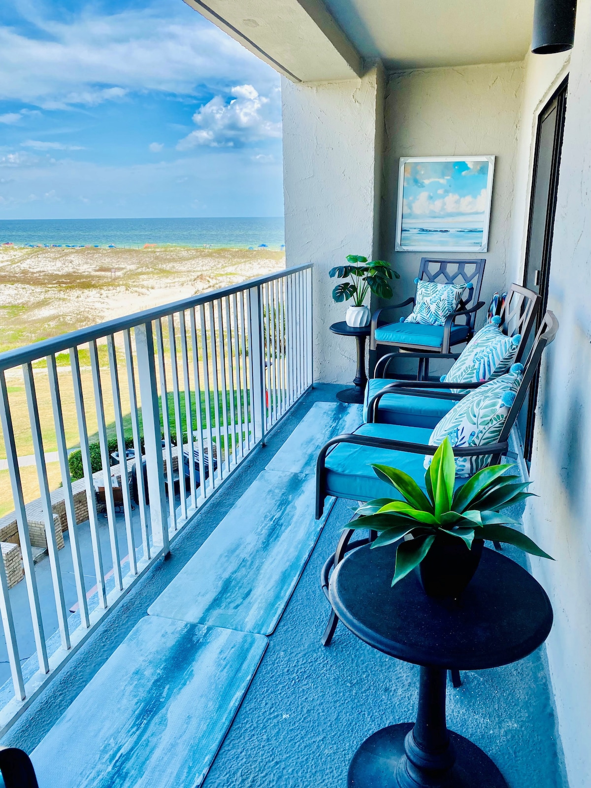 This one-bed/one-bath DIRECT beachfront condo is a top-floor unit at GSP The Resort (Bldg. 2) in Ft. Morgan that offers fantastic views of both Sunrises & Sunsets from your private balcony! You can feel the fun beach vibe when you step inside and know you're on your beach vacation! It's updated with "weathered-wood" tiled floors, a tiled walk-in shower, a vessel sink, and an L-shaped kitchen for extra counter space & storage. We aim to work with each guest so our GetAway remains 5-STAR worthy!