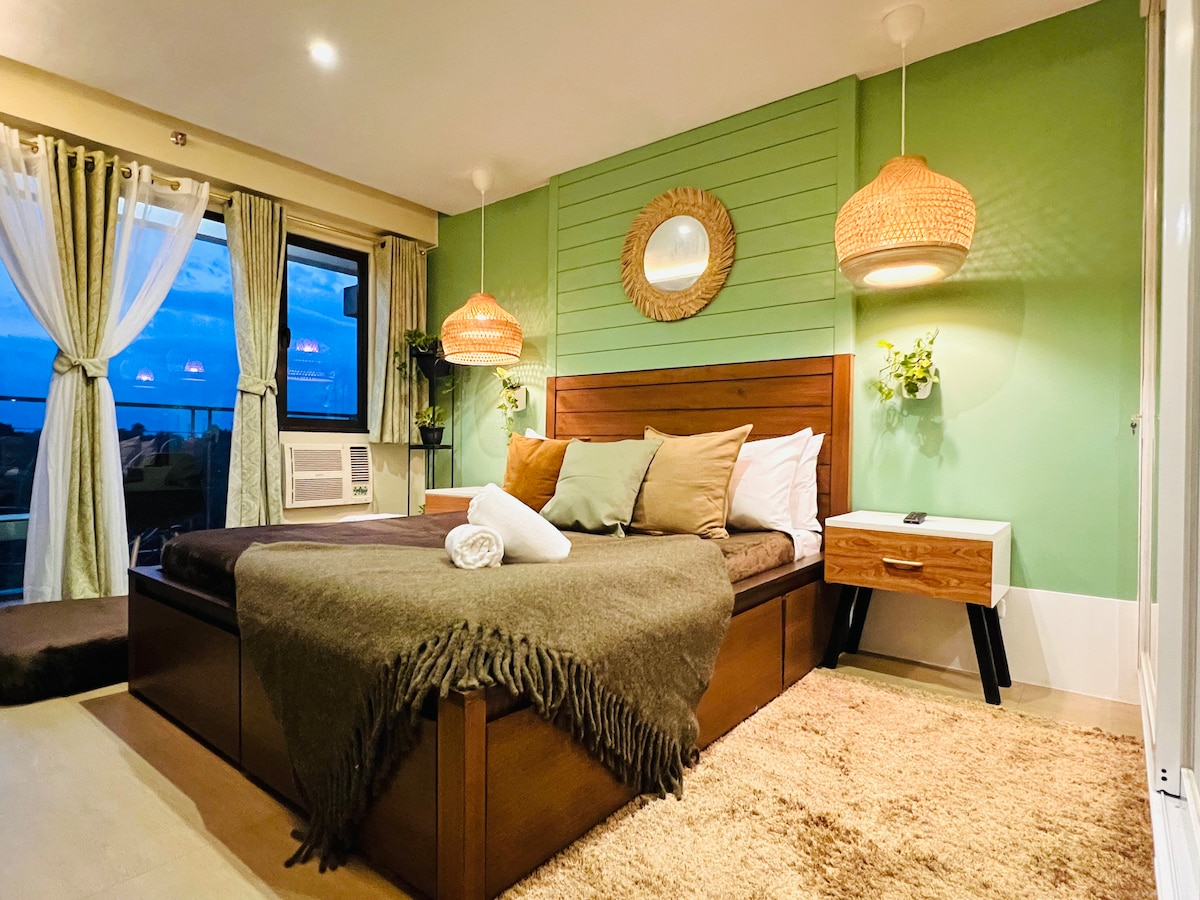 - Across SM City Mall (cinema, supermarket, dept. store, cafes, Anytime Fitness) - 2 Bedrooms with Patios, lush view. - 1 Queen Bed, 1 Full Bed - Up to 1 Extra Mattresses available upon request (Advance Notice pls) - Free Swim Pool Access for 4 Persons (P200/person for excess) (Advance Notice pls) (Pool not available on Mondays) - Pay Parking Available (P200/night. Advance Notice please) - Broadband Wifi - Kitchen - Washing Machine - Self-Check in - Check in: 3PM - Check out: 11AM