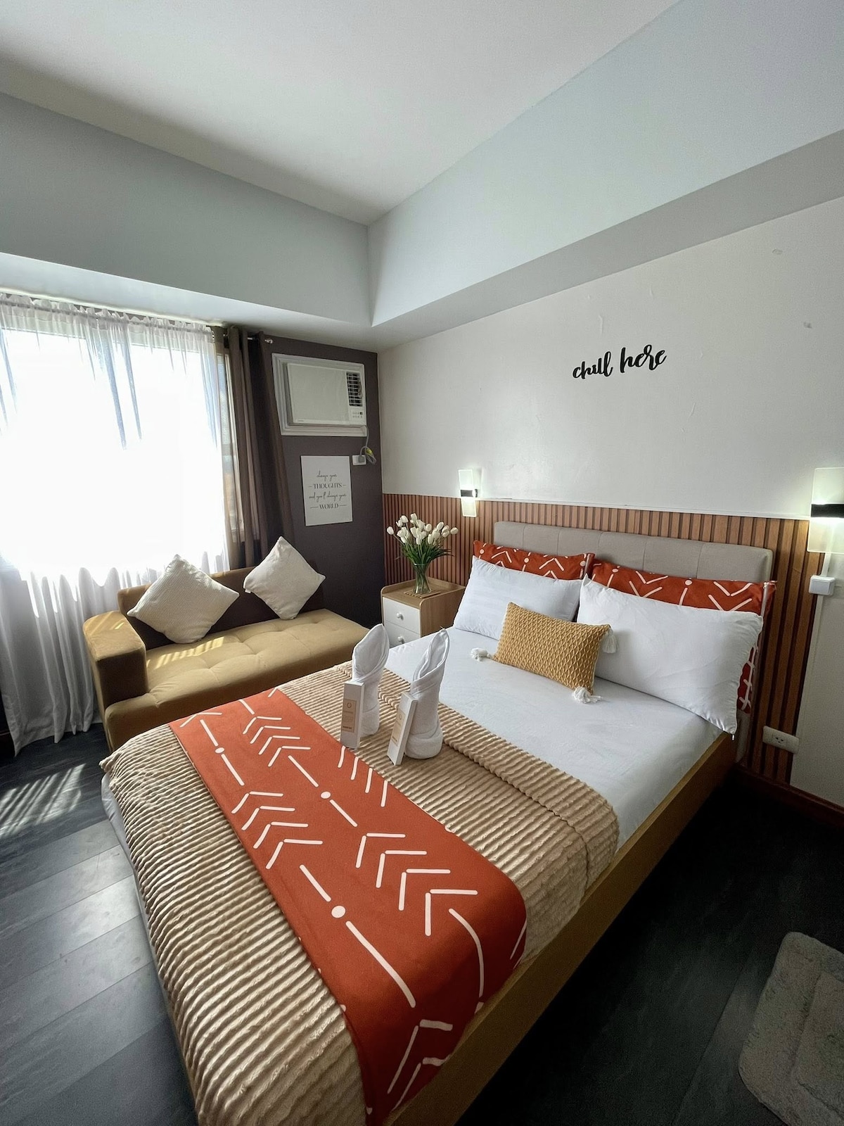 Relax and unwind in this comfortable and spacious one-bedroom condo in the heart of Davao City. Enjoy the stylish Condo and amenities it comes with it: ✅ free Car Parking ✅ unlimited WiFi ✅ 2 smart Tv with Netflix ✅ Washer and Dryer ✅ Cozy Bedroom w/ Queen size Bed ✅ Office desk w/Chair ✅ hardwood Dinning table and Chairs ✅ complete kitchen equipment ✅ microwave, water dispenser, Rice Cooker, water heater And More.