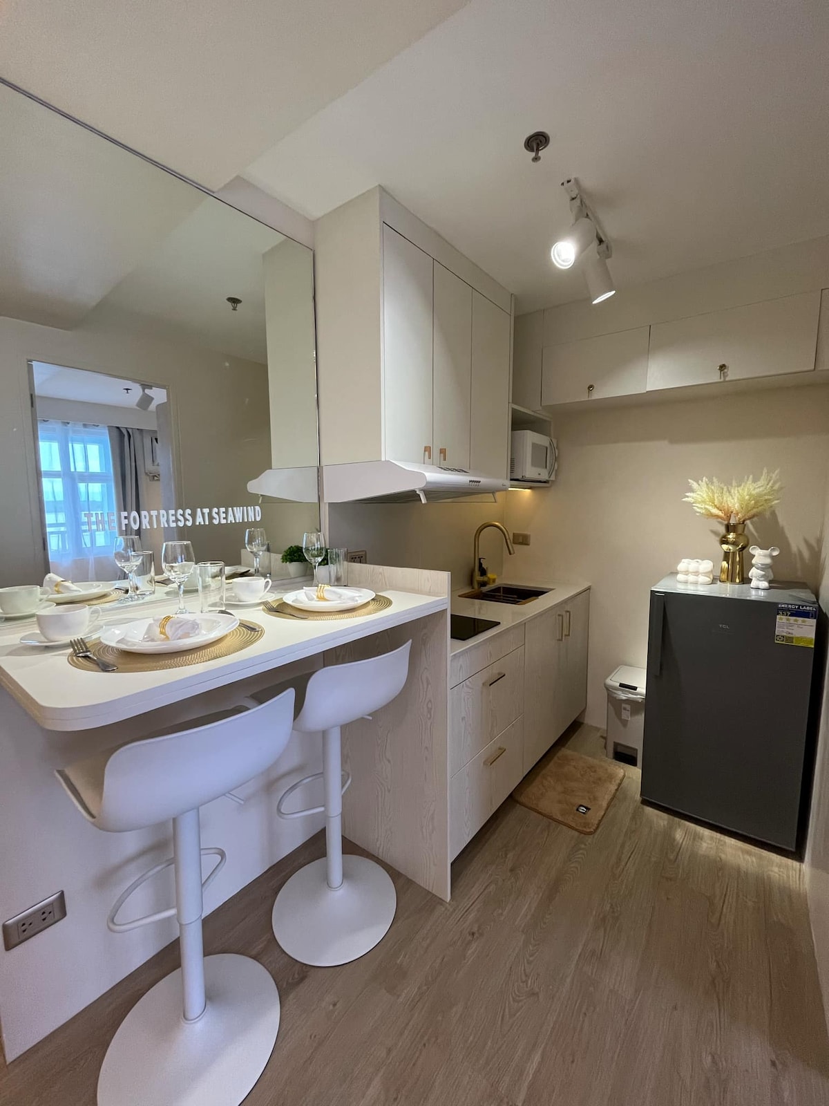 Our place is a 36.98sqm. Contactless and Self Check-In 2 Bedroom & 1 Bathroom Condo with fully furnished, well-equipped kitchen. The air-conditioned condominium unit feature a modern interior and a modern decorative touch. It features panoramic view of Samal Island. Near Davao International Airport, Sasa Wharf, Dusit Thani, Azuela Cove and many more. Location: Seawind Condominium by Damosa Land, Tower 6, 5th Floor, KM 11, Sasa, Davao City