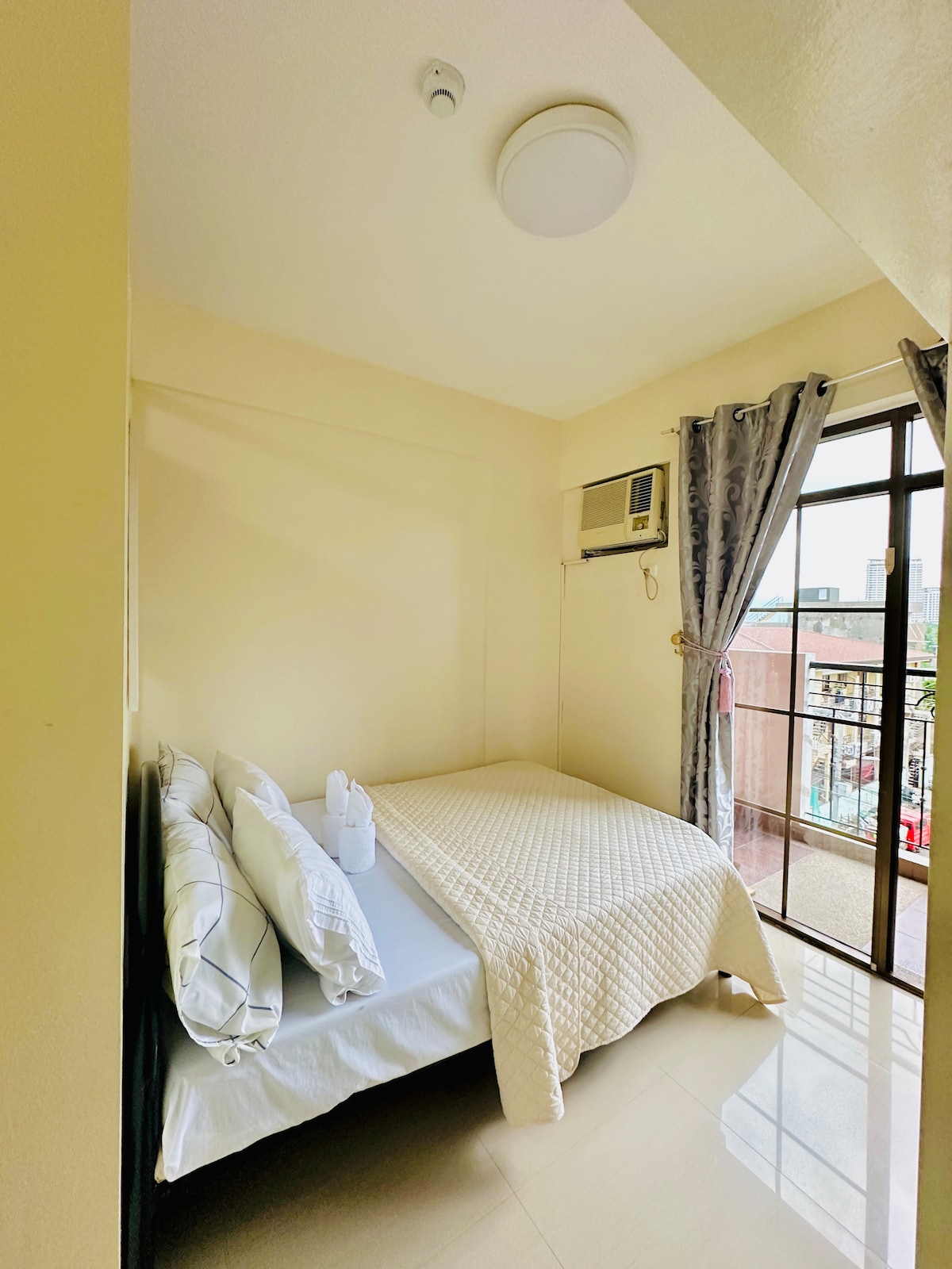 - Across SM City Mall (cinema, supermarket, dept. store, cafes, Anytime Fitness) - 2 Bedrooms with Patios, lush view. - 1 Queen Bed, 1 Full Bed - Up to 1 Extra Mattresses available upon request (Advance Notice pls) - Free Swim Pool Access for 4 Persons (P200/person for excess) (Advance Notice pls) (Pool not available on Mondays) - Pay Parking Available (P200/night. Advance Notice please) - Broadband Wifi - Kitchen - Washing Machine - Self-Check in - Check in: 3PM - Check out: 11AM
