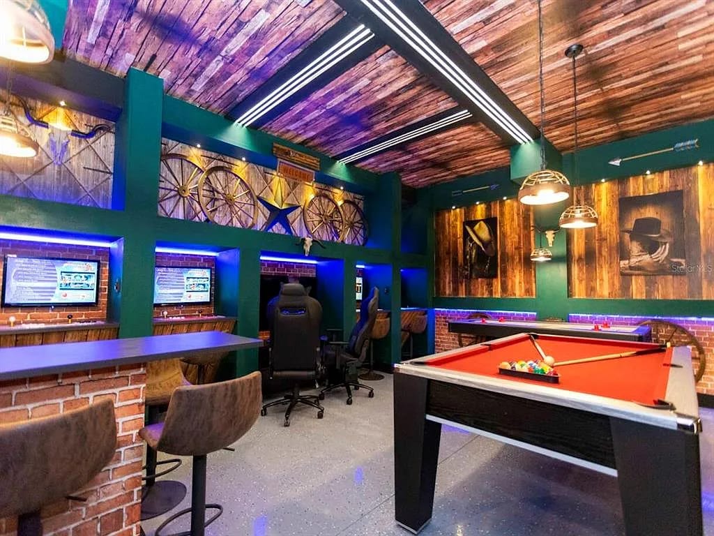 Welcome to a truly unforgettable, one-of-a-kind Luxury themed home!! Inside, discover a custom-built pool table made from real car parts, two professional Mario Kart arcade machines, and 14 strategically placed TVs—guaranteeing nonstop entertainment in every room. Step outside into your private oasis, complete with a fully equipped summer kitchen, immersive surround sound, and outdoor TVs perfectly positioned so you can enjoy your favorite movies from the hot tub or pool.