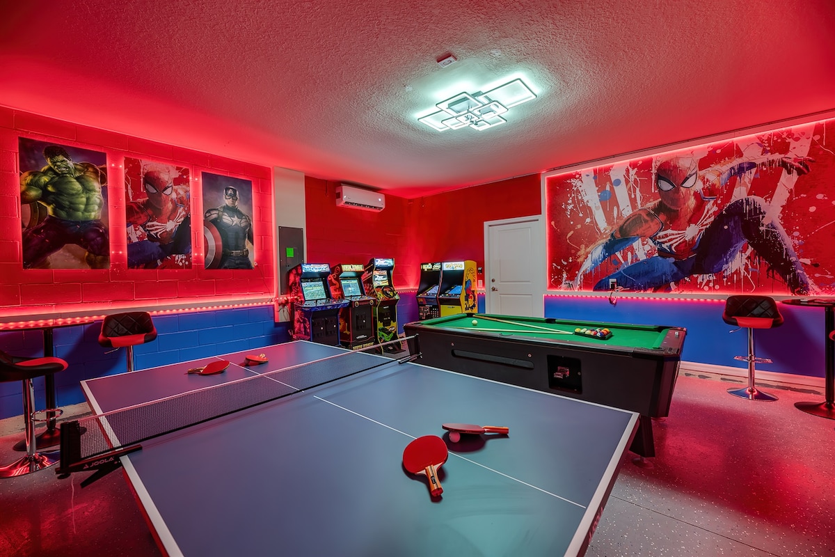 Level up your Orlando vacation at 1upRetreat, a Mario-themed 4-bedroom townhome in ChampionsGate Resort. Designed for families and gamers, this home features vibrant themed rooms, a private splash pool, and access to a lazy river, splash pad, arcade, gym, and two clubhouses. Minutes from Disney and Universal, it sleeps up to 9 and includes fast Wi-Fi, a Nintendo Switch, free parking, and a dedicated workspace.