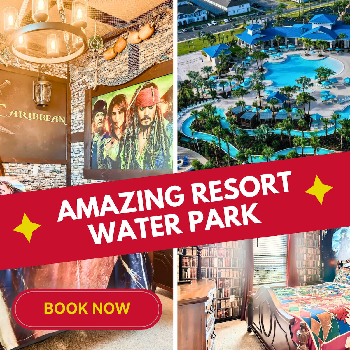 Experience your best vacation at Windsor Island Resort. - 5-Bedroom, 4.5 Bath POOL villa with themed rooms - Pirates of the Caribbean, Mickey, Harry Potter, Finding Nemo, and Toy Story rooms - Loft with game room, foosball table, and TV - Private screened-in pool - Resort-style amenities including a 5,000 sq.ft. clubhouse, water park, and lazy river - Free cable, internet, and parking - ALOHA CLUBHOUSE IS NOW OPEN