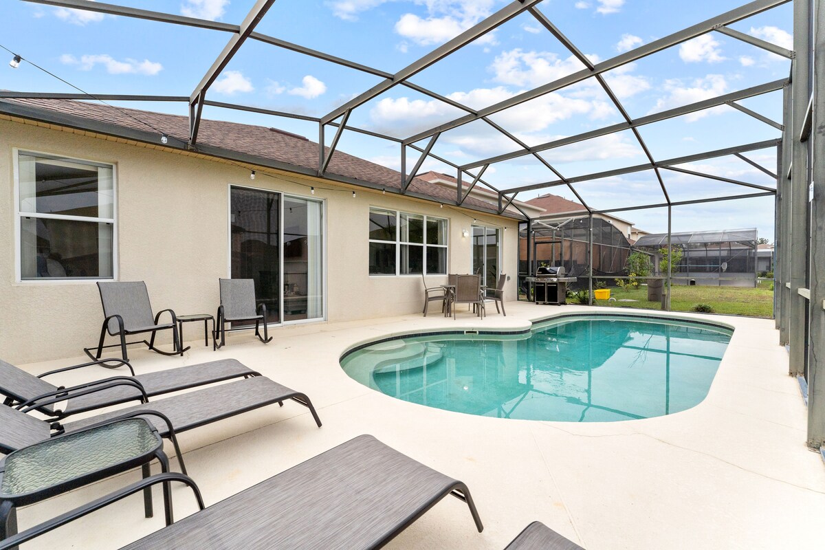 迪士尼和高尔夫球场附近的休闲4卧室泳池、火坑、烧烤架