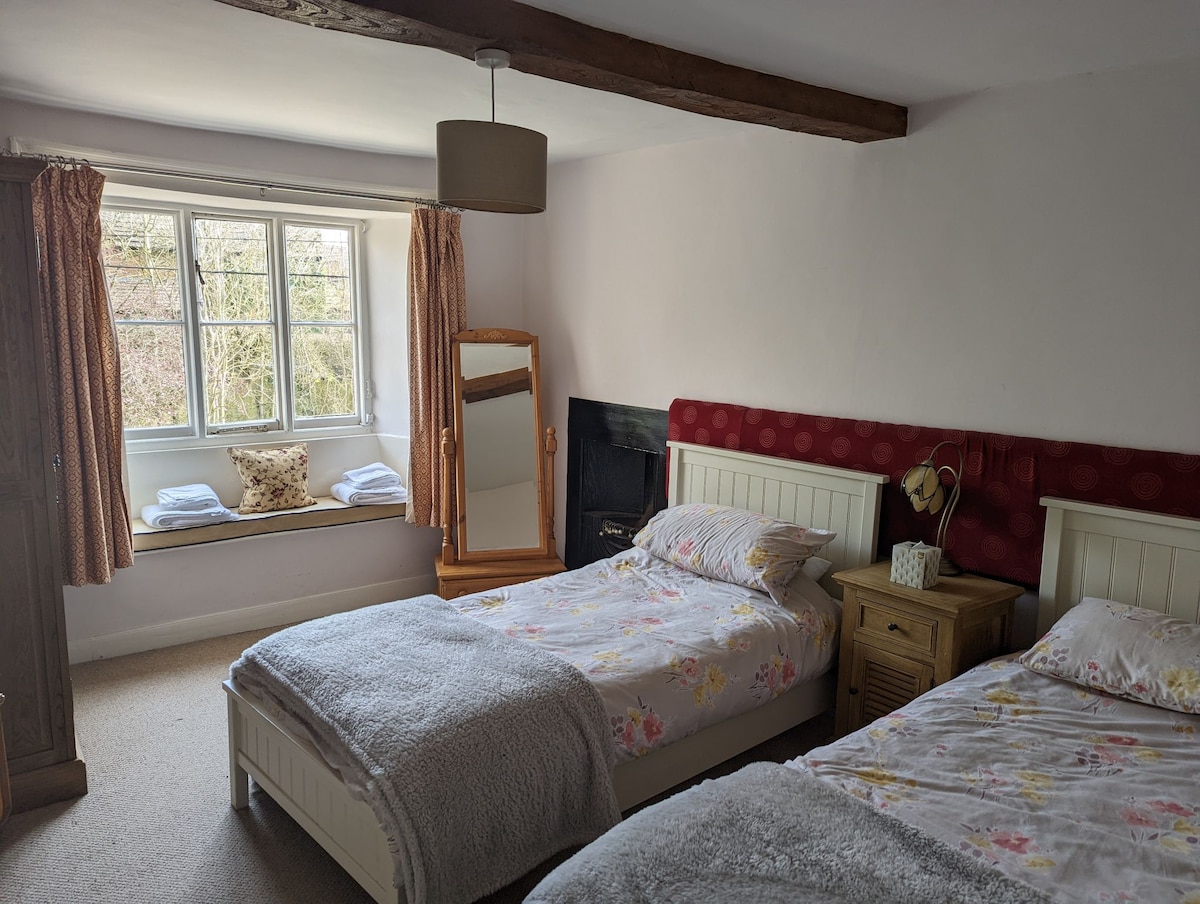 Our farmhouse is in a quiet remote spot with far reaching stunning views and a fantastic market town only 2 miles away Easy road access and parking The large and bright bedroom, has double and single bed and en-suite shower room Self service breakfast in guest dining room included Tea/coffee/fresh milk in room Shared guest sitting room with woodburner and TV, access to garden with patio seating Our 110 acre grass farm is open for you to enjoy and explore on the doorstep Very dog friendly too!