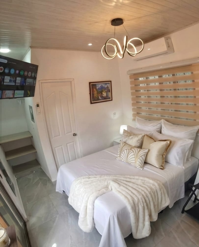Suite con entrada independiente: estacionamiento techado, cama doble, baño sanitario, cocineta y escritorio. Tu espacio personal en el corazón de David. Cuenta con aire acondicionado tipo split, abanico de techo, TV con acceso a netflix, internet wifi gratis, cortinas black out, tanque de reserva de agua, agua caliente, cocineta equipada con estufa eléctrica, refrigerador, cafetera, microondas y utensilios básicos. No cuenta con lavandería, generador eléctrico y aislamiento acústico.
