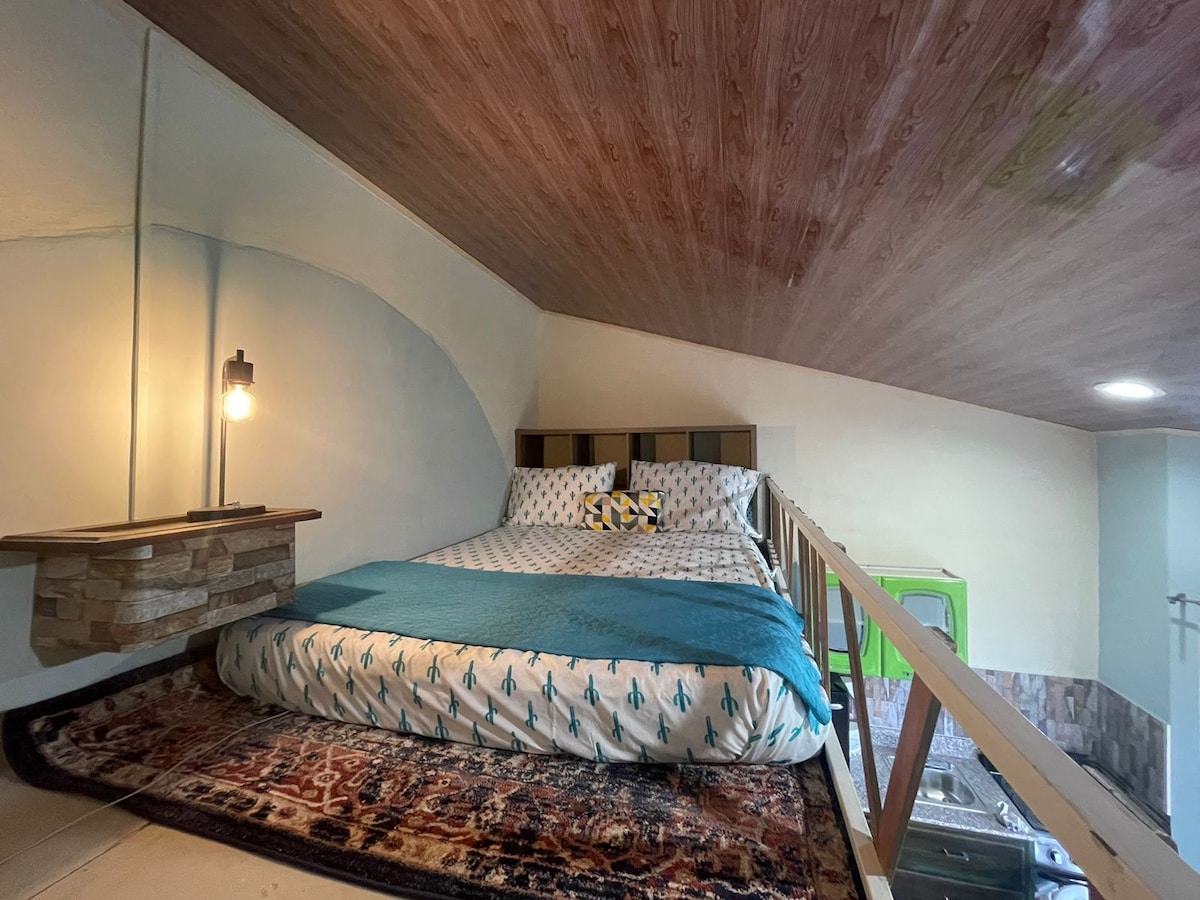 At CASA EJECUTIVA, this work-ready studio offers comfort and practicality for remote work. Enjoy spectacular views from the king bed, relax, and take in the sights of the town. A comfortable desk, fast internet, solar panels, a battery bank, and backup water ensure you stay connected and powered during outages. The fully equipped kitchen completes the space, providing everything needed for both work and leisure.