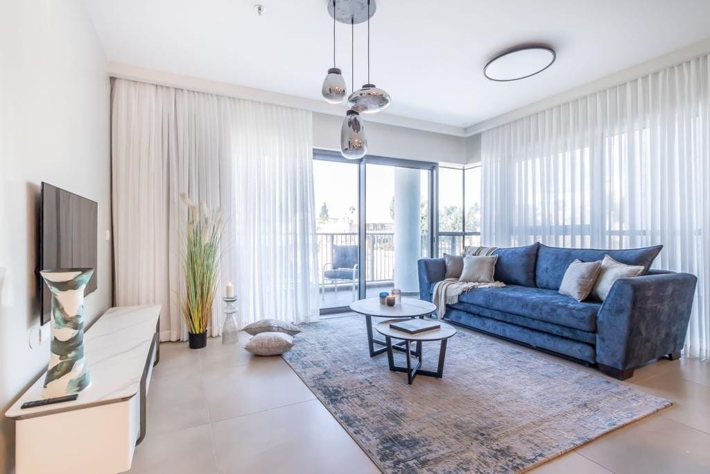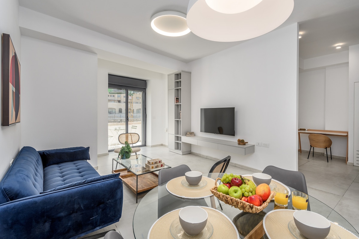 Welcome to the J85 Apartment”complex, located in the heart of Jerusalem. The apartments are located on Jaffa Street, close to the light rail station, the vibrant Mahane Yehuda Market, and within a short walking distance of the Old City. Each apartment includes 2 bedrooms, a bathroom, a living room, and a fully equipped kitchen. Every apartment has a private balcony, and there is also a shared terrace available for all guests in the complex. Each apartment can accommodate up to 5 adults + 1 child