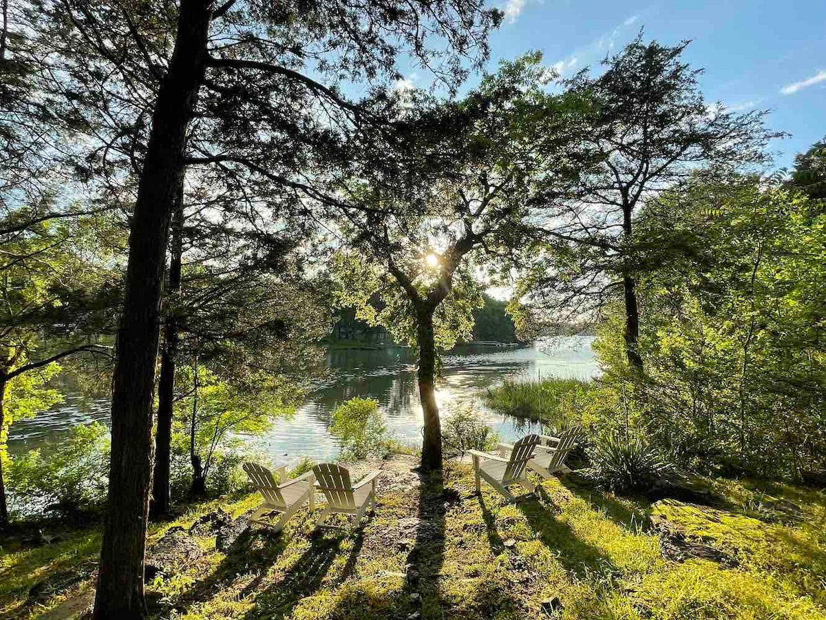 Beautiful and spacious guest quarters attached to large rustic lakefront cabin, with electric fireplace, gorgeous view of the lake and beautiful wooded backyard and creek, quick scenic walk to the lake, as property is lakefront. Swimming, boating, kayaking, (canoe and and paddle board provided). Canoe and Paddle Board provided (and oars/life jackets also)--canoes, kayaks, and paddle boards can launch from lakeside at property.