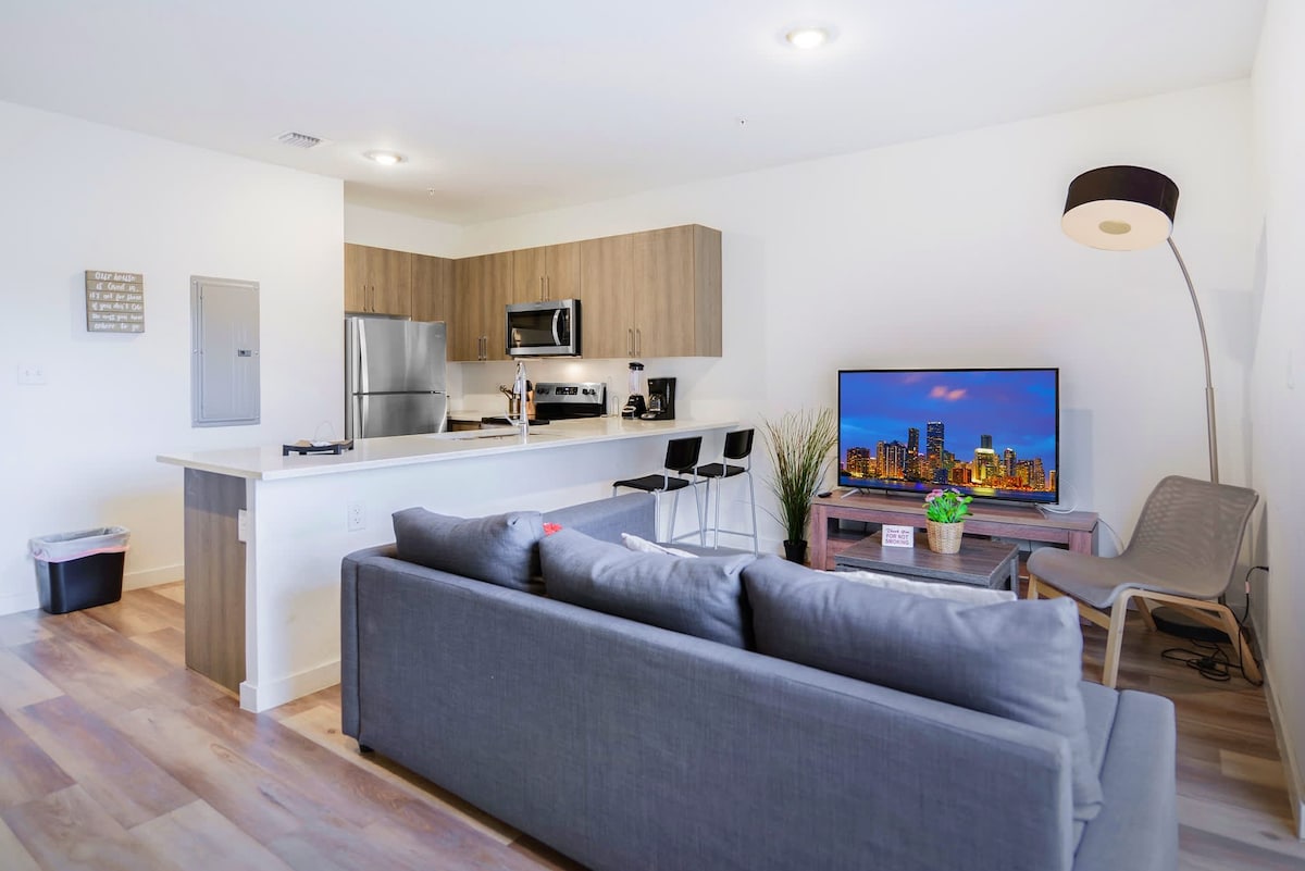 Rest & Relax in this coastal-inspired home-away from home. Features two gorgeous Suites each with a full bathroom, SMART TV & private balcony. Fully stocked kitchen, 65" SMART TV, ultra-fast 1Gb Internet, and lounge area. Premium amenities and top hospitality via your 5-Star Superhost. Sparkling Clean & fully compliant with all of AirBnb's sanitation & safety protocols. We are exempt from hosting service animals and pets due to health reasons. Just 5 min from the beach and 15 min from airport.
