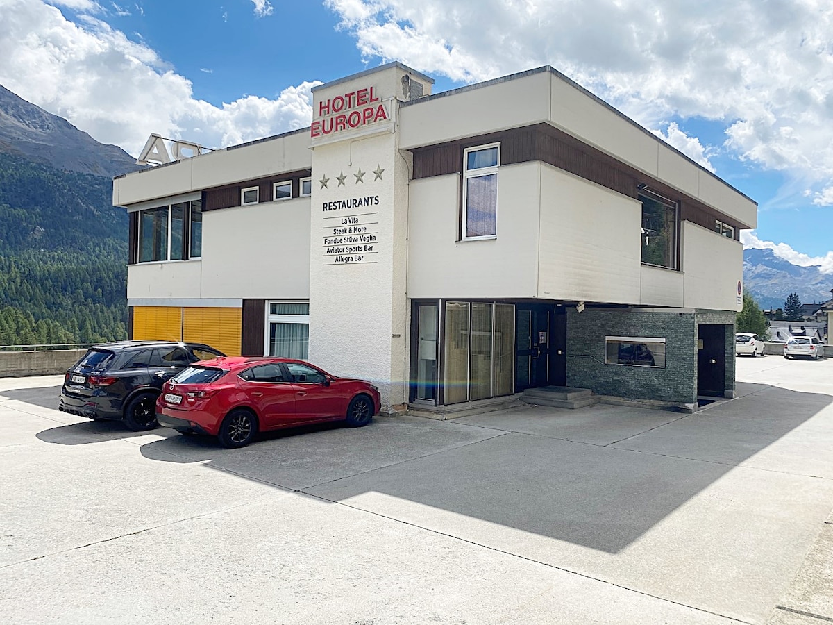 5 minutes by car from the village center of St. Moritz. The apartment has a bed 160 x 200 meters, a sitting area, a fully equipped kitchenette, a dining area and a modern renovated bathroom. Enjoy the view of the Engadine from the balcony. The hotel facilities (Hotel Europa), including pool/spa/fitness can be used freely (not mid Oct. to end early Dec./ mid Apr. to early June). The nearest ski lift is 5 minutes away by car. Fast internet, smartspeaker, Netflix included.