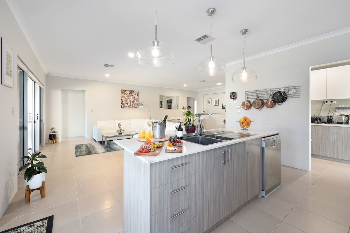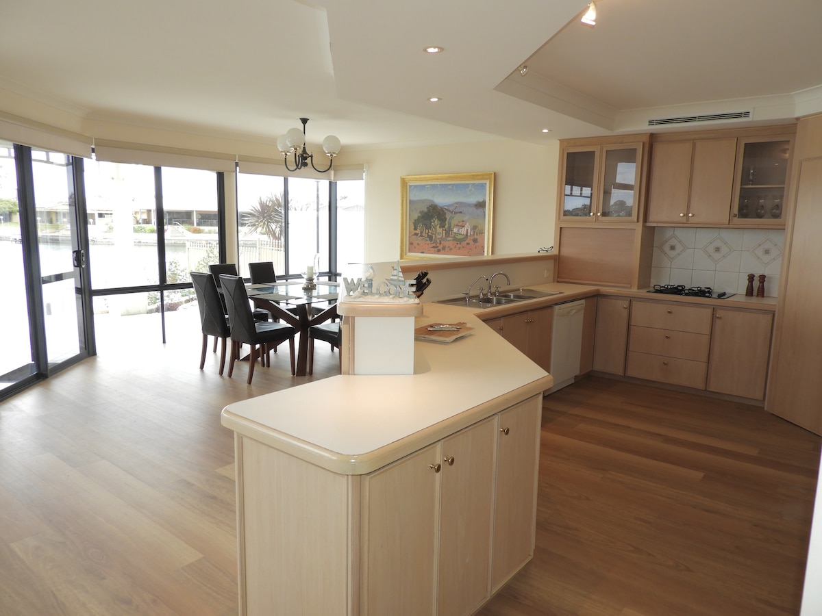Quiet retreat to enjoy a family holiday in this new Hampton style home with a 7m private jetty and kayaks. Suitable for children over 5 years of age. NO PETS allowed. Work from home away using the work space; printer and wi-fi. Bring your boat, ramps nearby and 5 minutes to Mandurah city and waterfront with plenty of great restaurants and cafes. Situated in a quiet neighbourhood at the end of the canal ; wine and dine enjoying the sunset and view with a bbq in the alfresco.