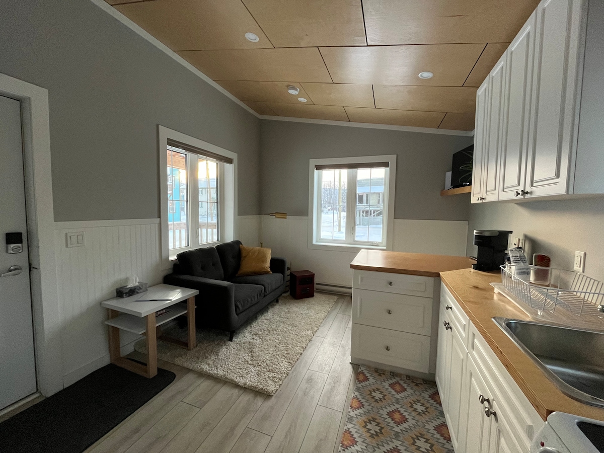 Modern, private micro studio in downtown Dawson City. Features a queen bed, walk-in shower, full kitchen, in-suite washer/dryer, and private entrance. It does not have a separate bedroom. Each stay includes one $20 gift card to Riverwest Bistro - a popular local cafe. Central, quiet, walkable location near shops, restaurants, and the Yukon River. Ideal for solo travellers or couples seeking comfort, simplicity, and convenience. Please note that this suite has Wifi, but no TV.
