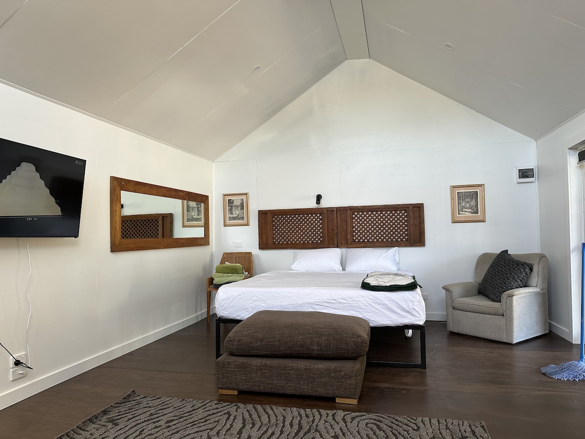 Step back in time with a stay at our original 60s A-frame amongst the pine trees. When you approach the private driveway, you are instantly transported to a different time and place; a mountain chalet in a European fairytale. Zoli’s A-frame has been lovingly restored and renovated with high-end fittings and fixtures and a glamorous mid-century aesthetic. Stepping through the doors, striking timber beams and rafters of a classic A-frame greet you. Snuggle up in front of the wood fire and enjoy!