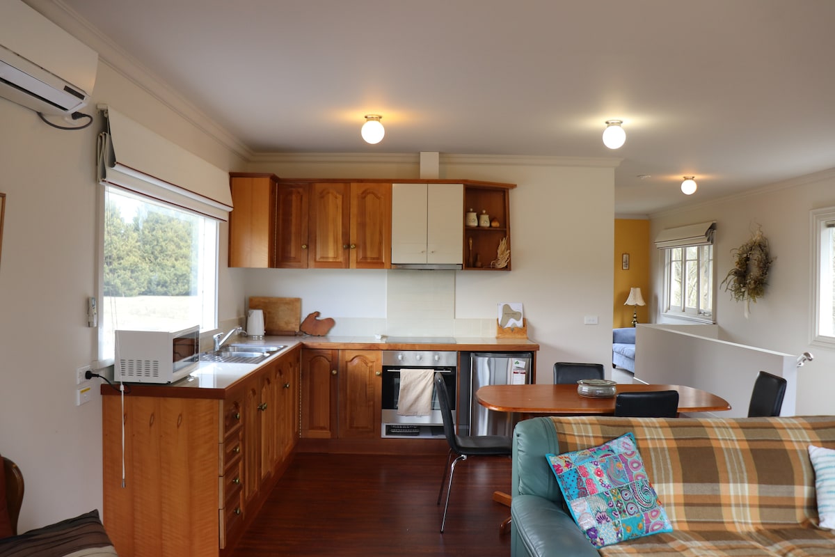 Complementary Continental Breakfast and no Cleaning Fees! Set in open farmland and surrounded by eucalyptus bush the "Kitchen Cottage" is a free standing, private dwelling adjacent to the old house. Enjoy the relaxing peace and serenity, the views and the walks. Daylesford is just 7 minutes away with excellent cafes, restaurants, interesting stores, spas, and an abundance of outdoor areas to explore. 5 minutes west is our local pub, the " Swiss Mountain Hotel" in Blampied.