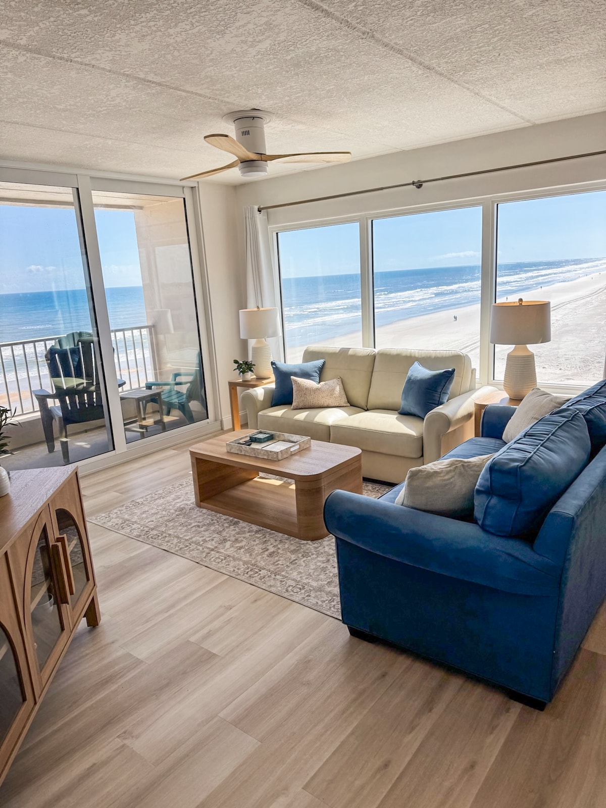 There is nothing more therapeutic than waking up to a beautiful sunrise. Come and enjoy a newly renovated happy place that feels like home. This fully equipped one bedroom condo is a direct oceanfront on the 14th floor overlooking great amenities: multiple swimming pools, a 300-foot long lazy river, waterslide, jacuzzies and a kid's water park. To top it off it is next to the Daytona Beach Bandshell, Ocean Walk Shoppes and movie theater with live concerts and fireworks in the summer months.