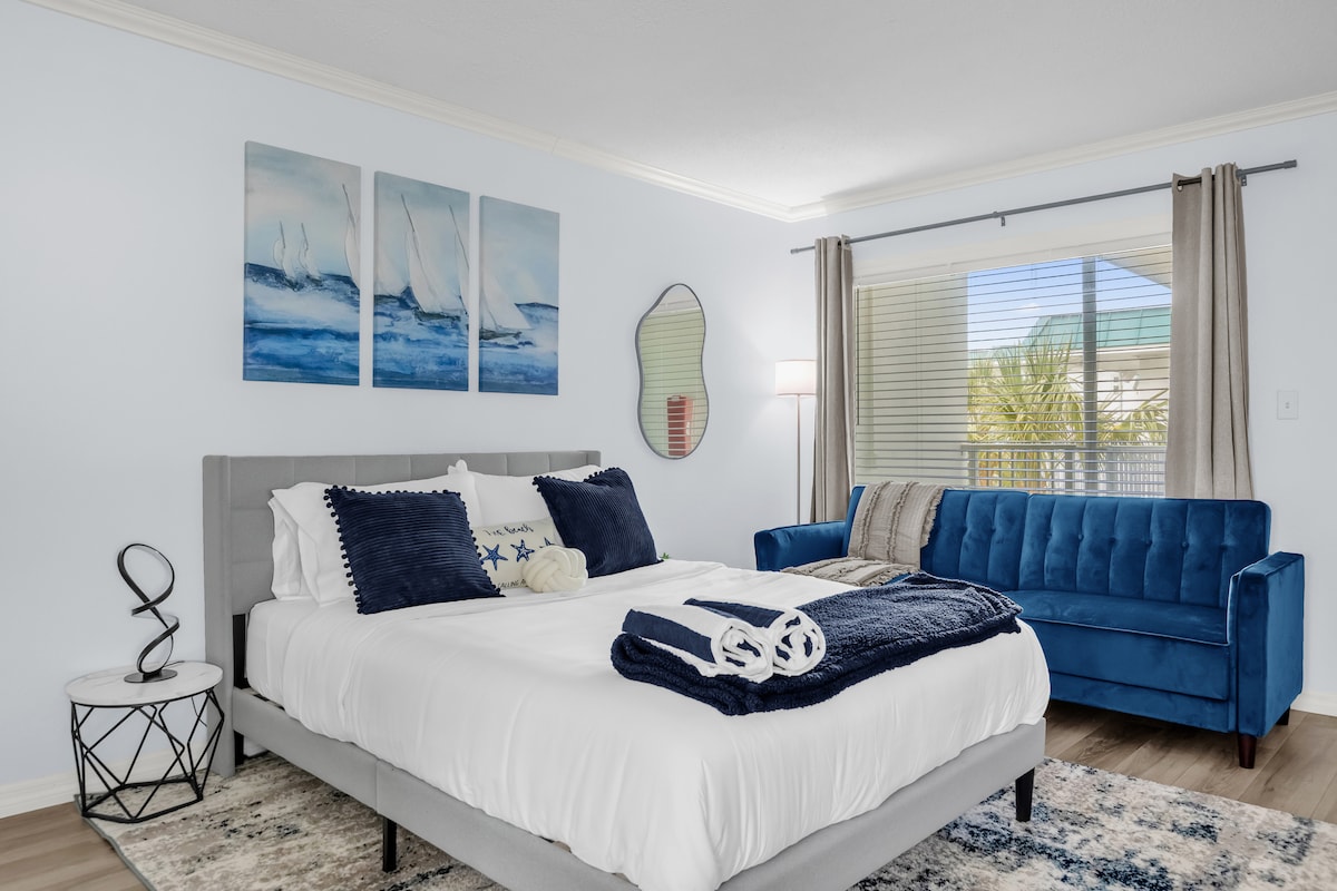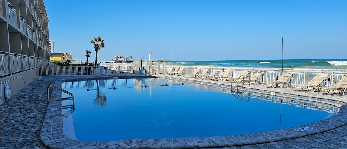 We are one of the closest airbnb to the boardwalk, OnThe Worlds Most Famous Beach with an open Pool 65inch Tv Come enjoy our Newly Furnished Studio with Amazing Top Floor Beach Views. We are the Closest AIRBNB on the Beach to the Daytona International Speedway With king bed and Queen sleeper sofa. Centrally located in the Heart of Daytona Beach. walking distance to the Pier Boardwalk, Restaraunts, and Main Street We have FREE parking for 1 vehicle and provide Coffee,Cream,Sugar,bch chairs