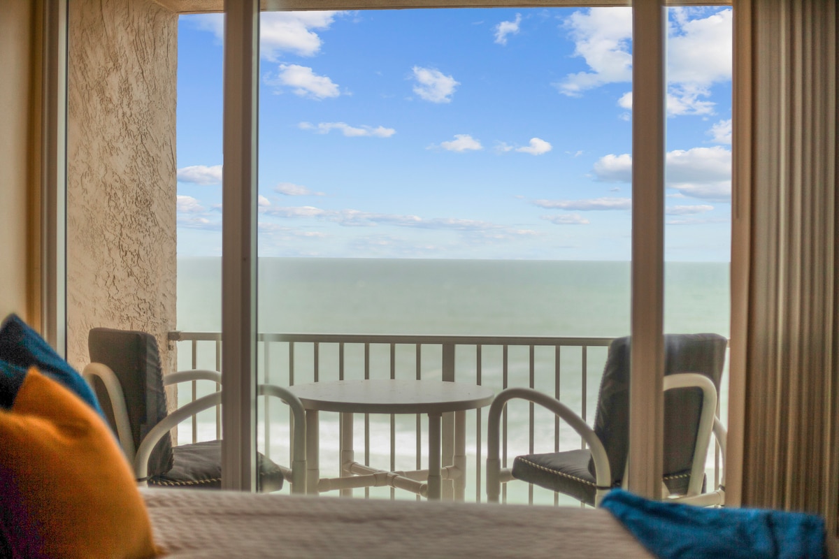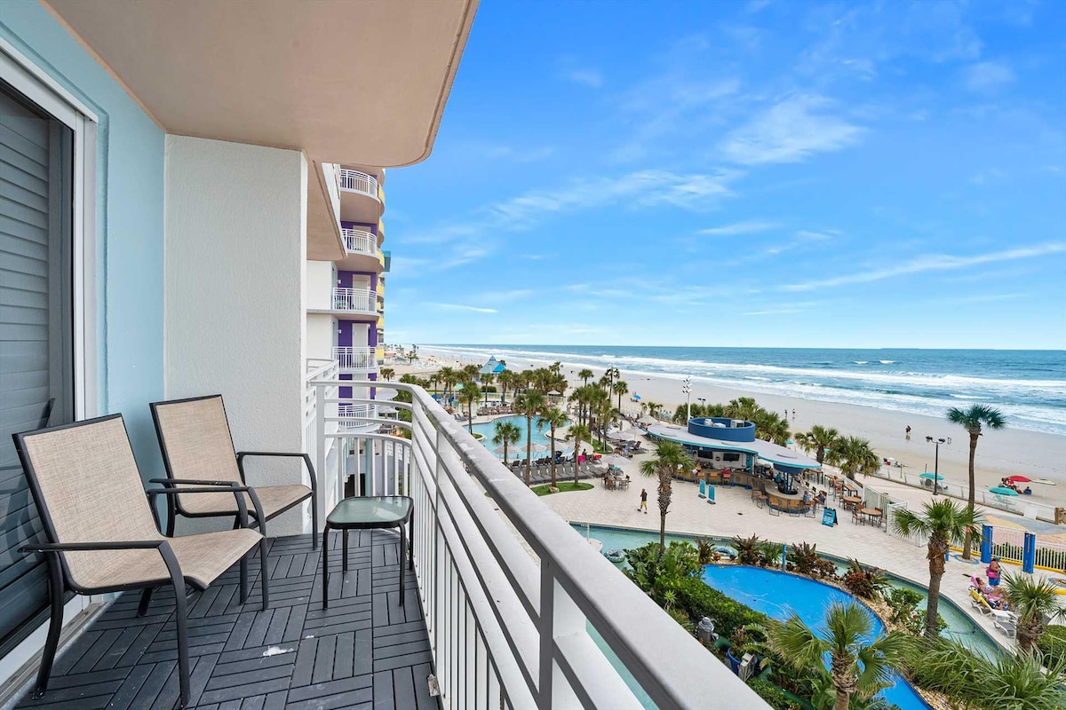 Oceanfront studio condo with a beautiful view. with wide shared balcony with seating. The current rate reflects ongoing storm-related repairs and closures of some amenities. Ideal for guests who value being close to the beach and ocean views over perfection and understanding the challenges. Some recently opened: **Open Amenities • 8:00 AM – 8:00 PM • One Outdoor Pool • Indoor Pool • South Spa • Fitness Center / Gym • Sauna **Primary guest registration with ID required through guest portal.