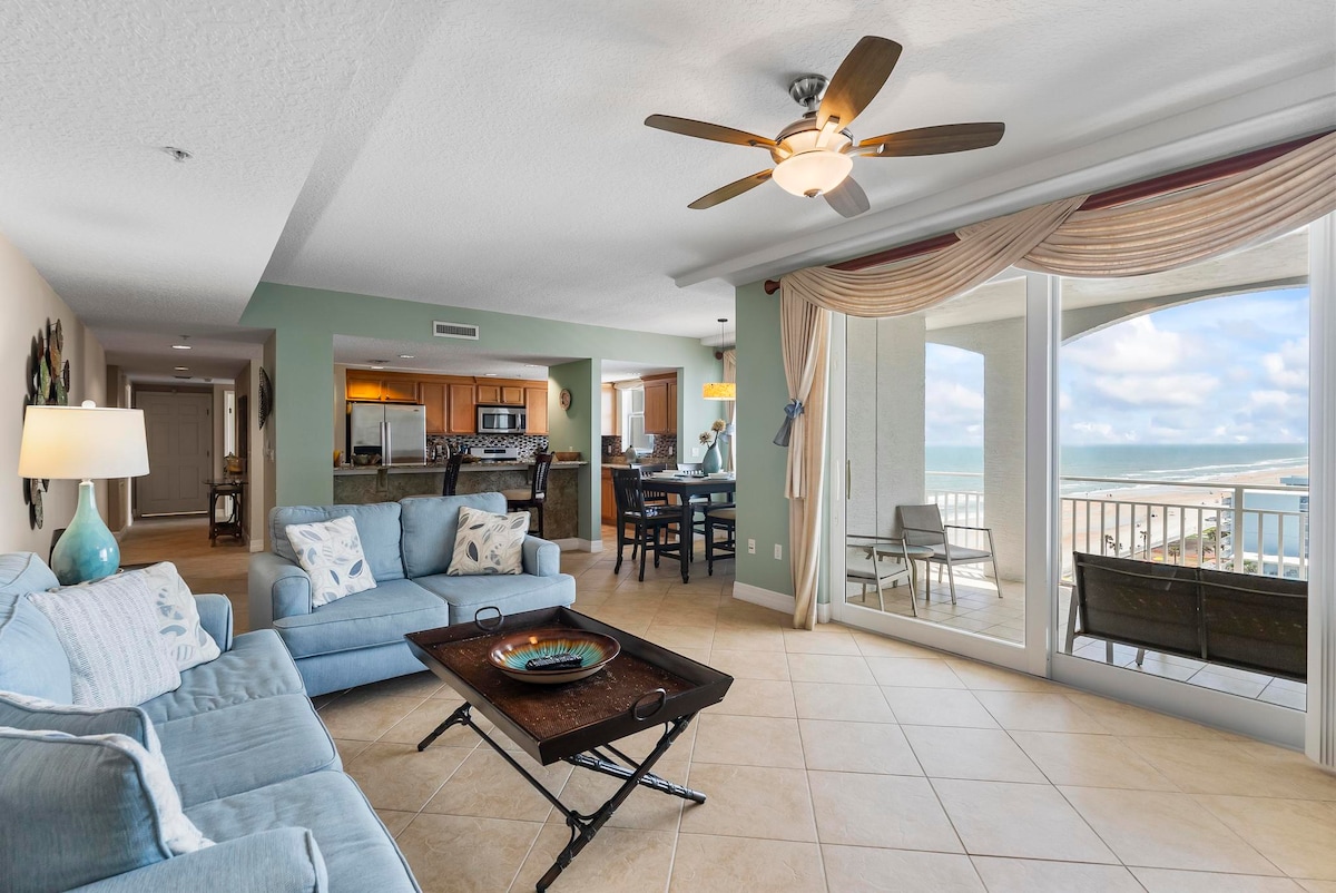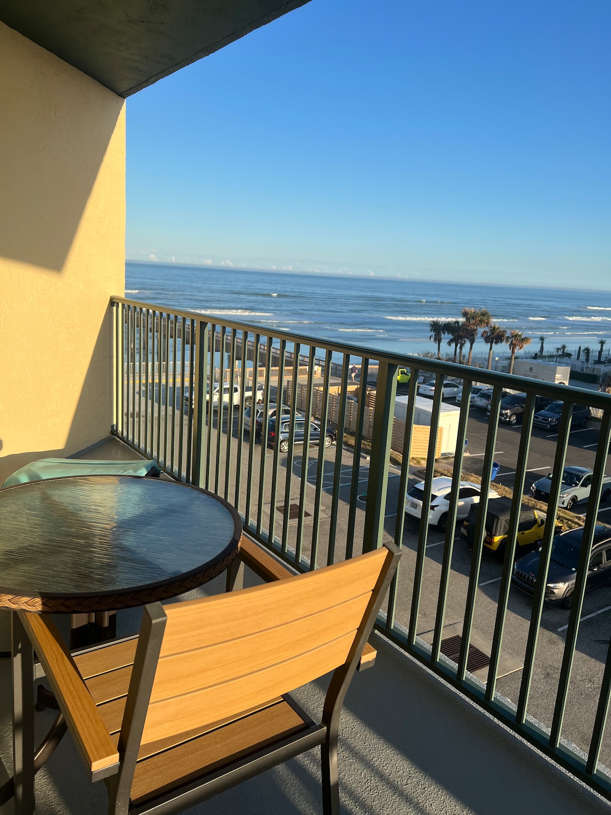 **The new pool and deck is open! Walk on the beach directly from our deck!!** Beautiful beachfront Daytona suite newly renovated with a panoramic view to the beach and pool from a private balcony. The condo has a plush king bed, kitchen, and free onsite parking for 1 vehicle! Enjoy being within a mile of popular attractions such as the Boardwalk, Peabody, & Bandshell. We are located on the famous drive-on Beach side- where you can park right on the sand and relax just feet from the waves.