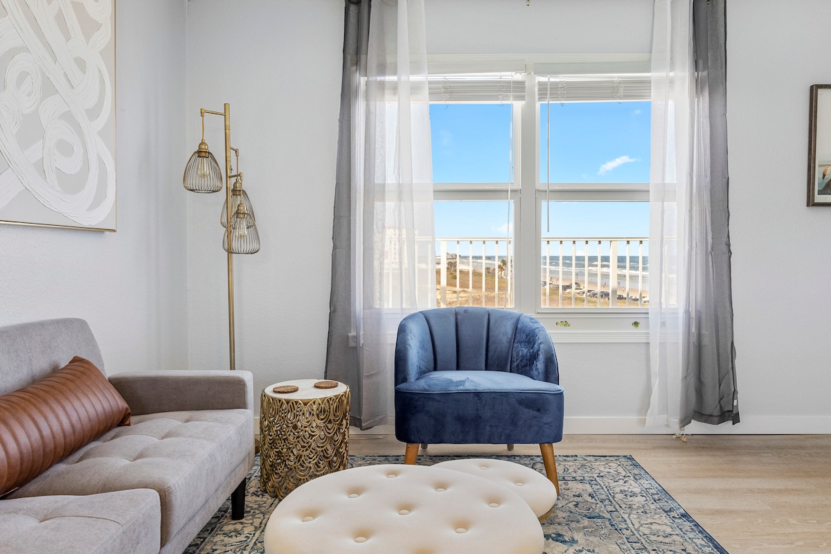 Experience the ultimate beach getaway in our freshly remodeled 1-bedroom, 1-bathroom apartment, perfectly situated right on the oceanfront in the heart of Daytona Beach. Ideal for couples, solo travelers, families or business visitors, this stylish and modern retreat offers breathtaking views and unmatched convenience. Step out onto your private balcony to enjoy your morning coffee or evening cocktails.