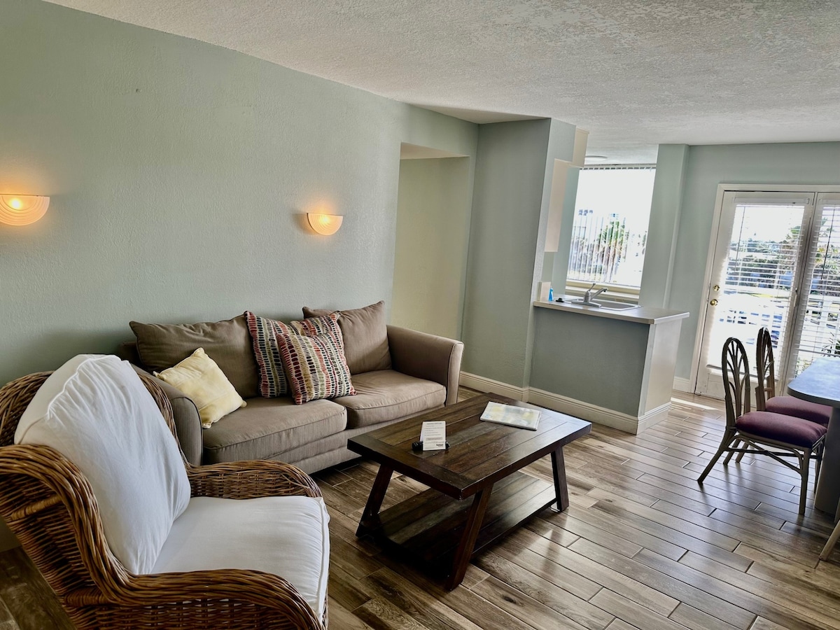 NIGHTLY PRICE REDUCED due to Building renovations restricting our balcony usage. There is no access to the balcony currently and the view will obstructed*. ON THE BEACH! Your very own cozy spacious studio in Daytona Beach Shores is the serene beach of Daytona and just a few short minutes away from a variety of activities and restaurants. Our 6th-floor unit is completely remodeled with free dedicated 45+Mbps WiFi, a full kitchenette, and free parking. *Our balcony is unavailable until April.