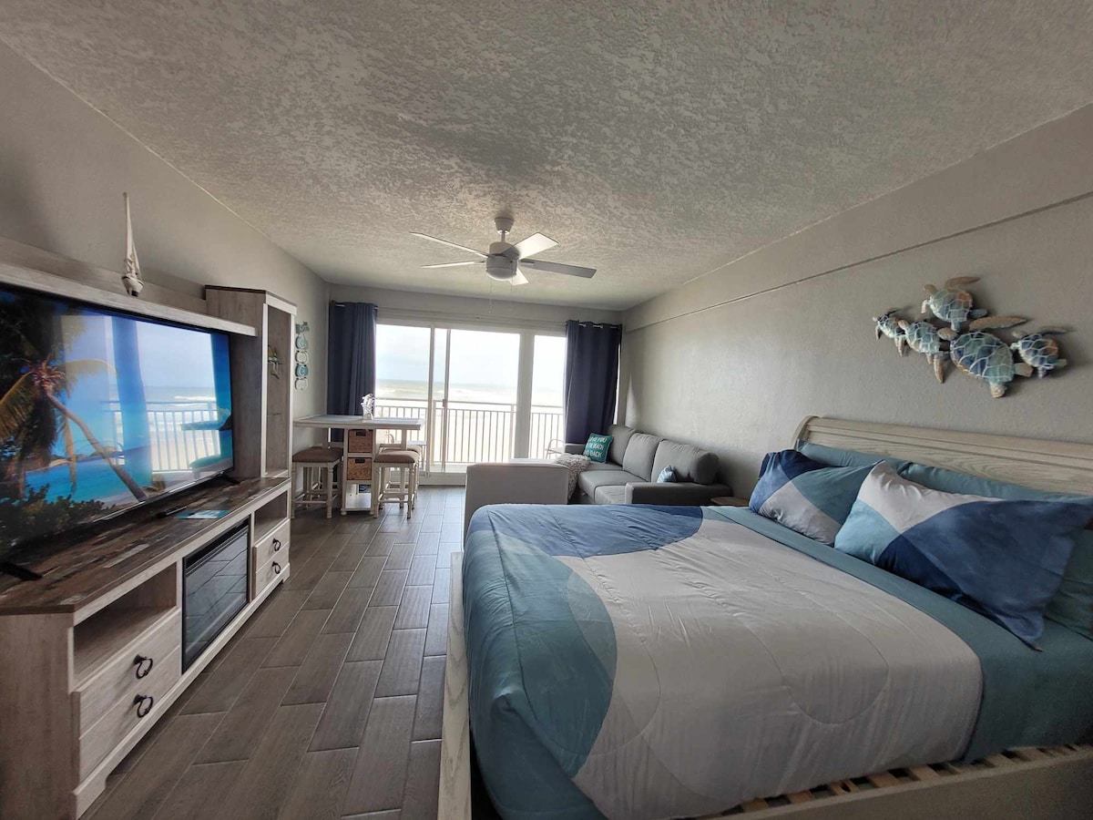 NIGHTLY PRICE REDUCED due to Building renovations restricting our balcony usage. There is no access to the balcony currently and the view will obstructed*. ON THE BEACH! Your very own cozy spacious studio in Daytona Beach Shores is the serene beach of Daytona and just a few short minutes away from a variety of activities and restaurants. Our 6th-floor unit is completely remodeled with free dedicated 45+Mbps WiFi, a full kitchenette, and free parking. *Balcony unavailable until March.