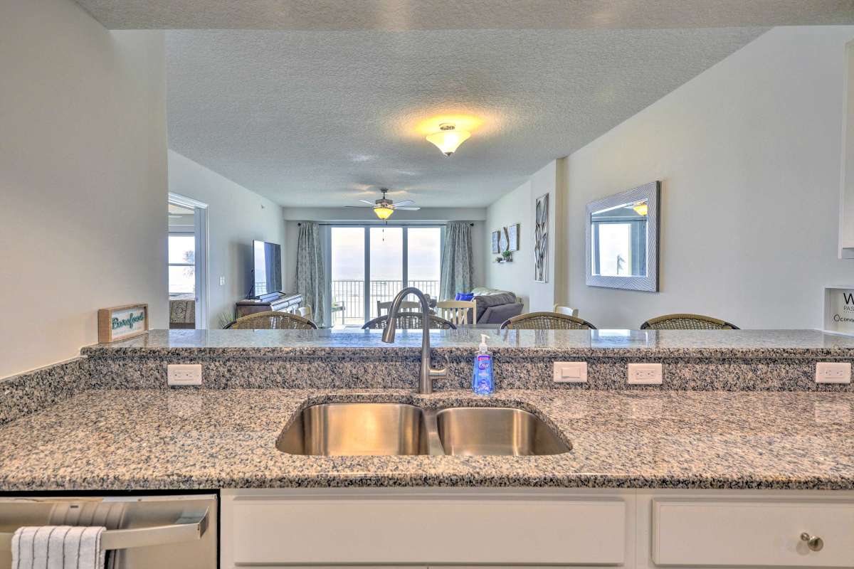 Enjoy your own piece of paradise! Ocean front condo with beautiful views of non drive beach. 2 bed/2 bath plus 3 bedroom off primary with day bed and barn door. Lots of beds, super comfy furniture, great for kids and Everything you need is here waiting for you! Beach chairs, beach umbrellas, boogie boards and more! Cook your meals in your own fully equipped kitchen, Grill downstairs or enjoy all of the excellent restaurants in the area. Unit has washer and dryer, all essential beach items.