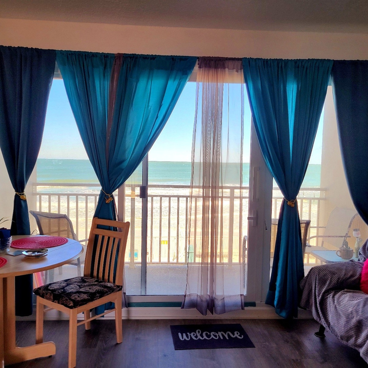 We are located on Daytona Beach a 1 minute walk through the pool area to be on the beach POOL IS OPEN AND INDOOR POOL IS OPEN Kick back and relax in our newly remodeled calm and stylish space. we have a full size refrigerator, you will fall in love with our balcony views. we have all pots and pans and kitchen supplies. all linens and beach towels included. we have 1 king bed and a futon couch big enough for 1 adult or 2 small children