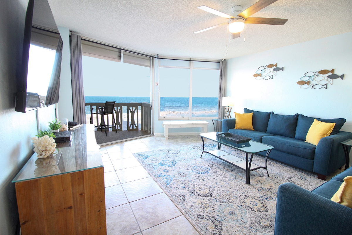 Wonderful direct oceanfront condo steps from the beach. Sit on your own private balcony listening to the waves while enjoying your favorite beverage. We offer a new queen sized pillow top mattress ,rollaway bed and recliner sofa. We also have a new Samsung 55"smart TV with full cable lineup and 100 mps WIFI. The kitchen is fully equipped ,but if you prefer not to cook Adams Egg restaurant is located right on the property