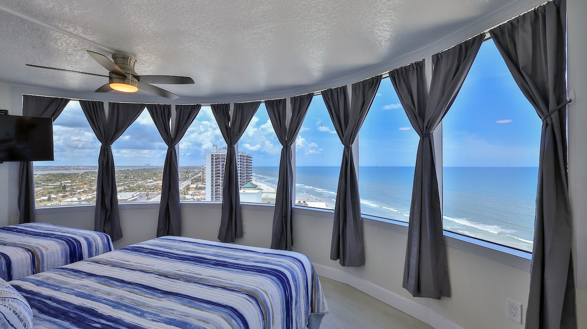 Enjoy a family-friendly stay in our 10th-floor condo at the sought-after Sanibel Condominium. Relish the breathtaking views of the Atlantic Ocean and the spectacular sunsets over the Halifax River from the expansive balcony. Situated directly on the beach, we have immediate and direct access to the sand. Please note, the building is strictly pet, smoke/vape-free, and there is a maximum allowance of two cars per unit. Minimum age is 21 to rent this unit, ID will be required prior to approval.