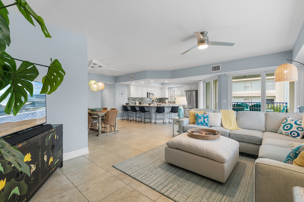 Make lasting memories at this spacious 1st-floor oceanfront condo in New Smyrna Beach’s quiet, non-drive zone. With 3 private balconies, stunning views, & no elevators to fuss with, it’s perfect for families. Enjoy a fully stocked kitchen, washer/dryer,& all the beach gear you need-chairs, towels, toys, boogie boards & more. Sleeps 6 comfortably with king size bed in primary bedroom, twin beds in second bedroom, queen size sofa bed & air mattress. Cozy, peaceful & ready for your coastal escape.