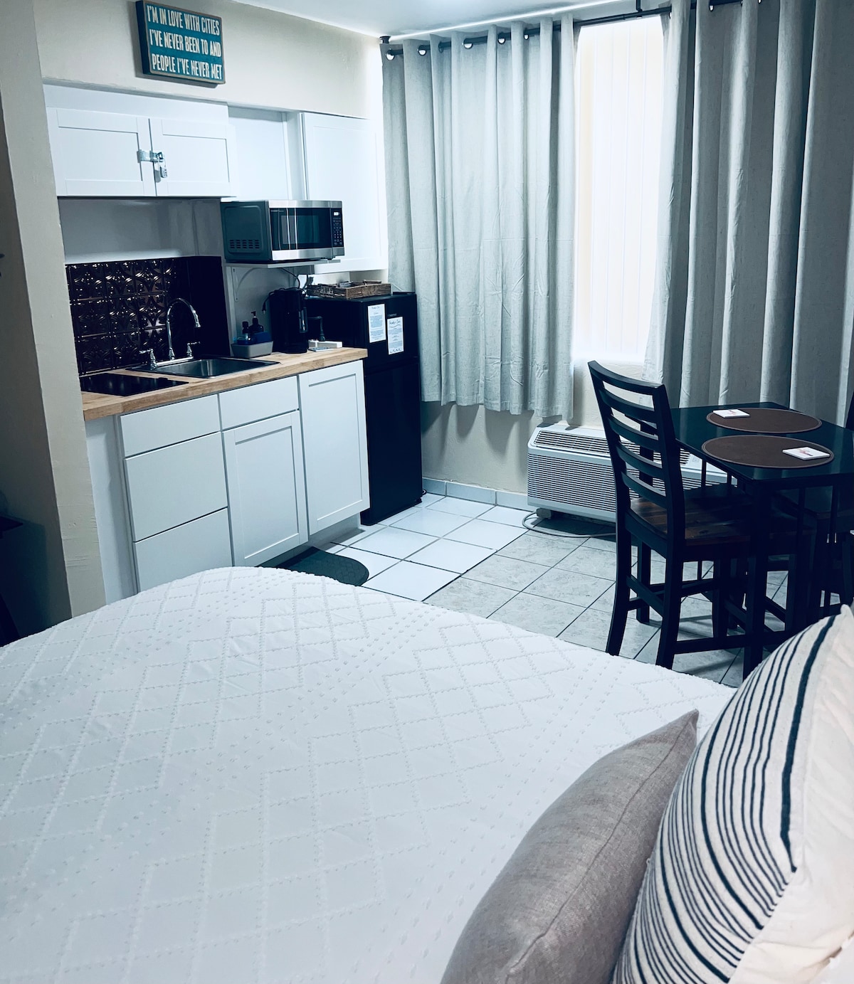 Wake up to stunning Atlantic Ocean sunrises, soak up beachfront fun, or take a peaceful stroll along the sand. Our beachfront motel offers all the comforts for a perfect stay in Daytona Beach🌴 ★★★Key Feature★★★ 🏖️ Beachfront with 24/7 Beach Access 🛎️ Receptionist available 🌅 Shared oceanview patio 🅿️ 1 Free Parking 🛏️ 1 King 👔 Coined Laundry ☕️ Coffee 🛜 Free WiFi ✅ Hotplate, mini fridge, microwave 🛒 Mini Marketplace 📍 local attractions & diners nearby ❄️ Ice Maker 🖨️ Printing Service