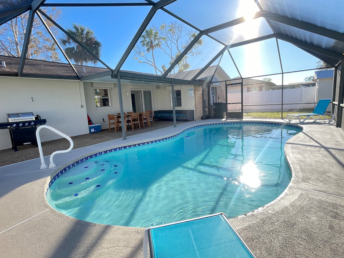 Costal beach home 200ft. from pristine no-drive beach.. close to grocery, restaurants and entertainment. Large pool deck with new pavers. 2 sun loungers have been added along with fresh landscaping. Large swimming pool. Located on a quiet street, this 2BR/2 BA home is the perfect location to relax & live like a local. Perfect for families & friends, this place is fully stocked and ready for your arrival, just bring your swimsuit, flops & sunglasses.