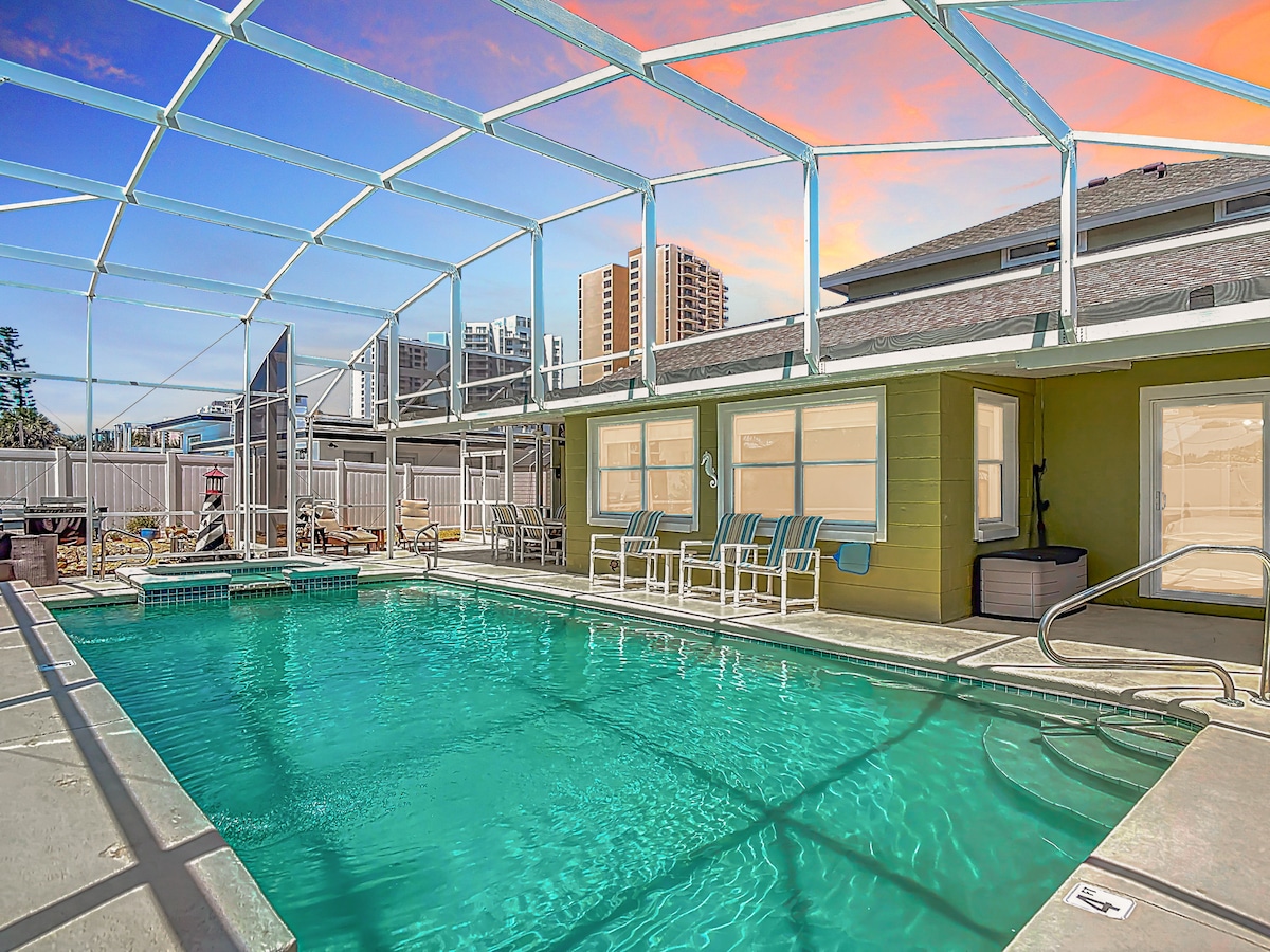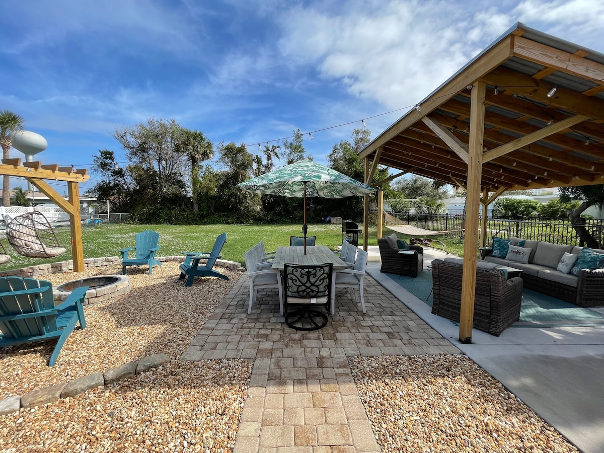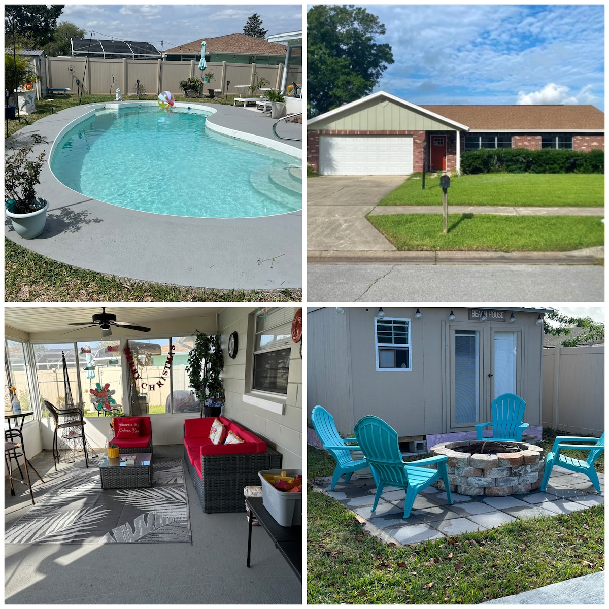 Newly renovated and located in a prime location. This is a great spot for your vacation. We are only a 10 min drive to the Beach and less than 15 min to international speedway. This house has an Open kitchen with stainless steel appliances and all the essentials! There is a fire pit in the backyard that leads out to a swing set, cornholes, and a screened in Heated pool with fun floats. The patio has a Monument propane grill, where you can BBQ and lounge under our pergola making fun memories.