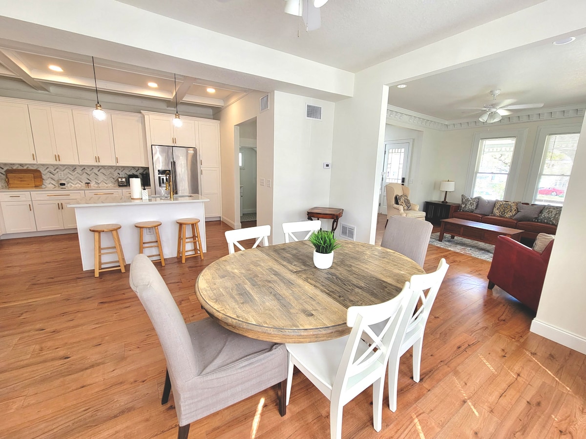 "Completely renovated, 4 bd 2 bth house. Fully furnished, non-smoking, home located in a family neighborhood. This home sleeps 8 comfortably with a king size bed in the master, full size guest room, and 2 twin beds in the 3rd bd , and bunk beds in the 4th bd. The mb has a large vanity and walk in shower. Gb has a single vanity with shower/bath combo. Yard with fire pit and weber grill. 3 smart TV's throughout.