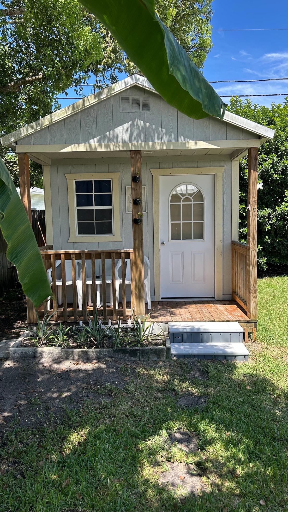 Escape to this cozy, private tiny house just 15 mins from the beach. Enjoy a comfy bed, Roku TV w/ Netflix, Wi-Fi, A/C, kitchenette, and full bath. Relax in hammocks, chill under patio umbrellas, Access the shared BBQ grill and covered patio area anytime. Private entry, free parking, peaceful yard with roaming chicken and a tropical vibe. Shops 4 mins away. Solo traveler’s dream stay!