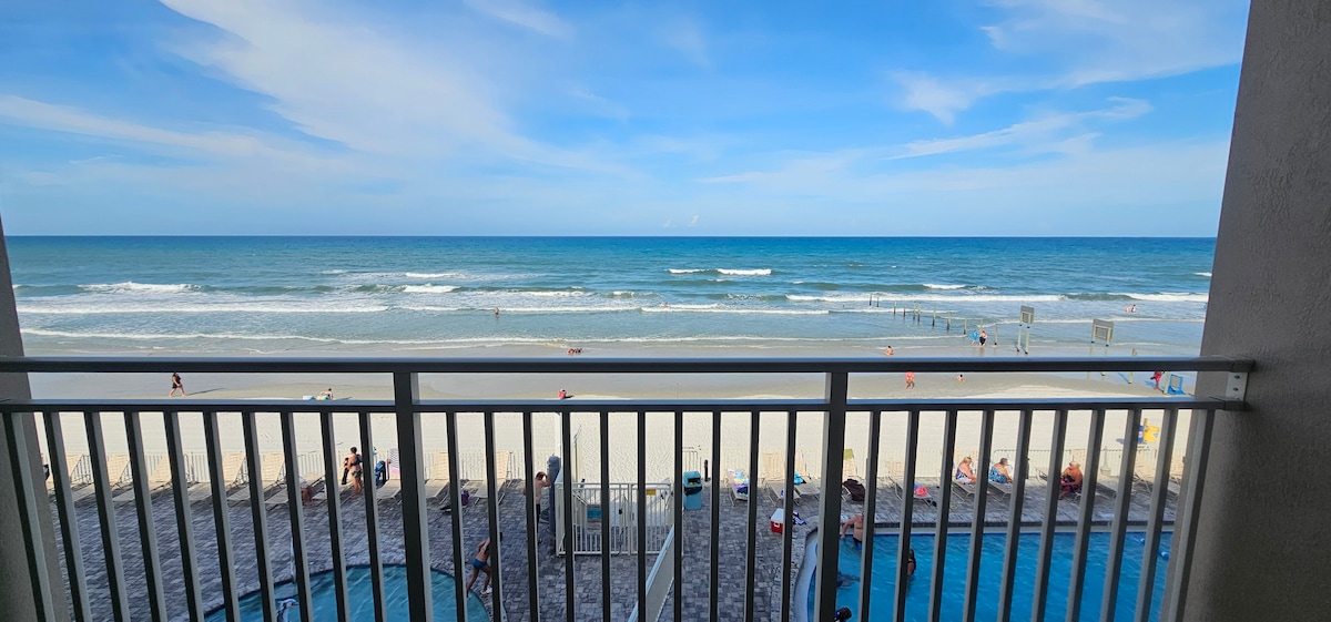 We are located on Daytona Beach a 1 minute walk through the pool area to be on the beach. You cannot beat this ocean view. This Studio has been completely remodeled in October 2024. Enjoy the new 75" TV and the oversized comfortable chair with ottoman. The table allows for dining and also for working. Spend time on the balcony overlooking the ocean and also with a view of our giant pool. It's the best place for people watching! Also enjoy many flocks of Pelicans flying by the unit each day.