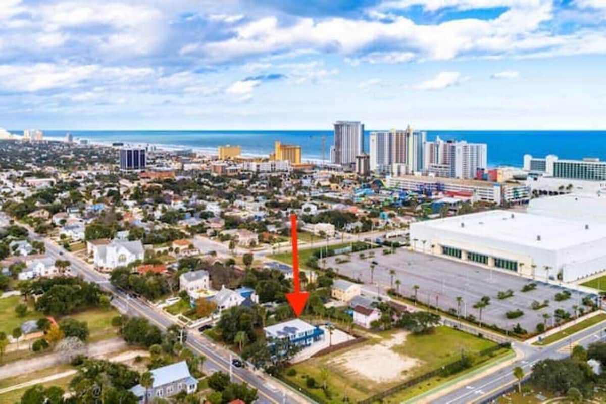 This one of a kind 725 sq ft home at the beach has a funky vibe, has been fully renovated, is ONE BLOCK TO THE BEACH, steps from the Ocean Center, & 1 block from Main St! It is equipped w/ a full kitchen to cook meals in after a day at the beach, an office desk for remote work, 3 total beds & a washer/dryer on the fully screened in back porch! *1 Car Garage to park motorcycles in or a small SUV/ car! Additional trailer/vehicle parking in front of the house. See photos.*