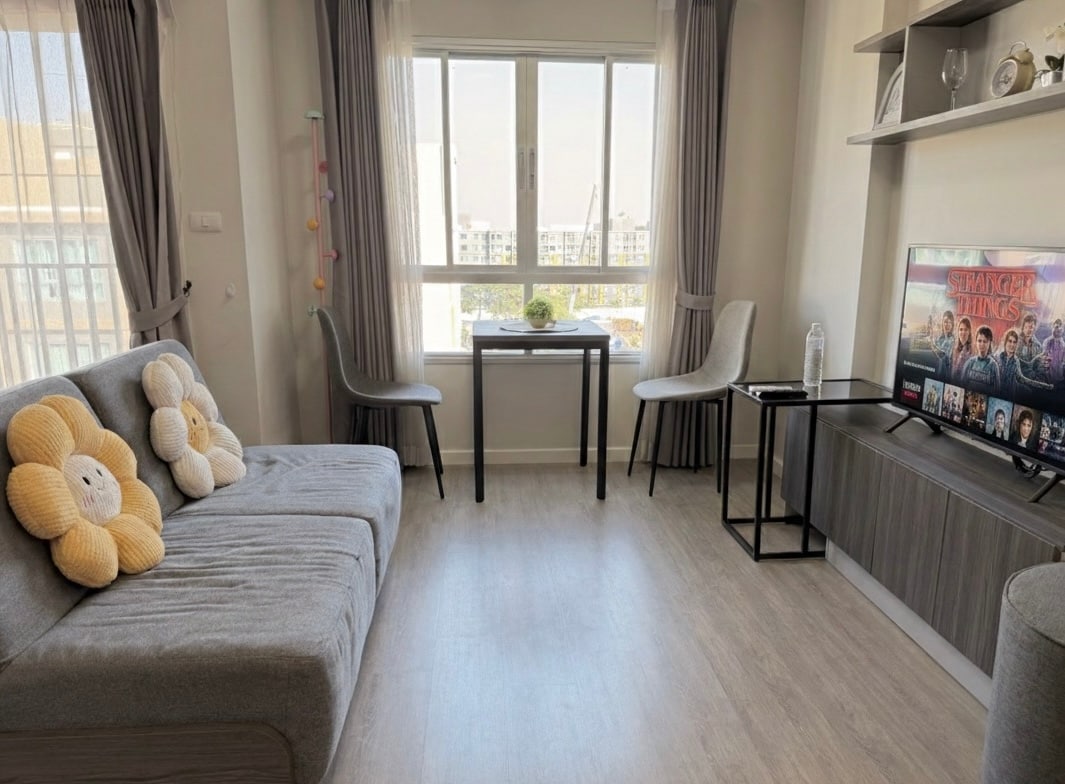 A stylish condo room with separate living and sleeping areas, a comfortable bed, bed rail for baby and a foldable floor bed for an extra guest, our space is perfect for couples or small families. Enjoy the cozy living space with a dedicated dining area. Access high-quality shared facilities like a gym, pool, and sauna, creating a resort-like atmosphere. Plus, take advantage of our convenient location within walking distance of the largest shopping mall in Chiang Mai.
