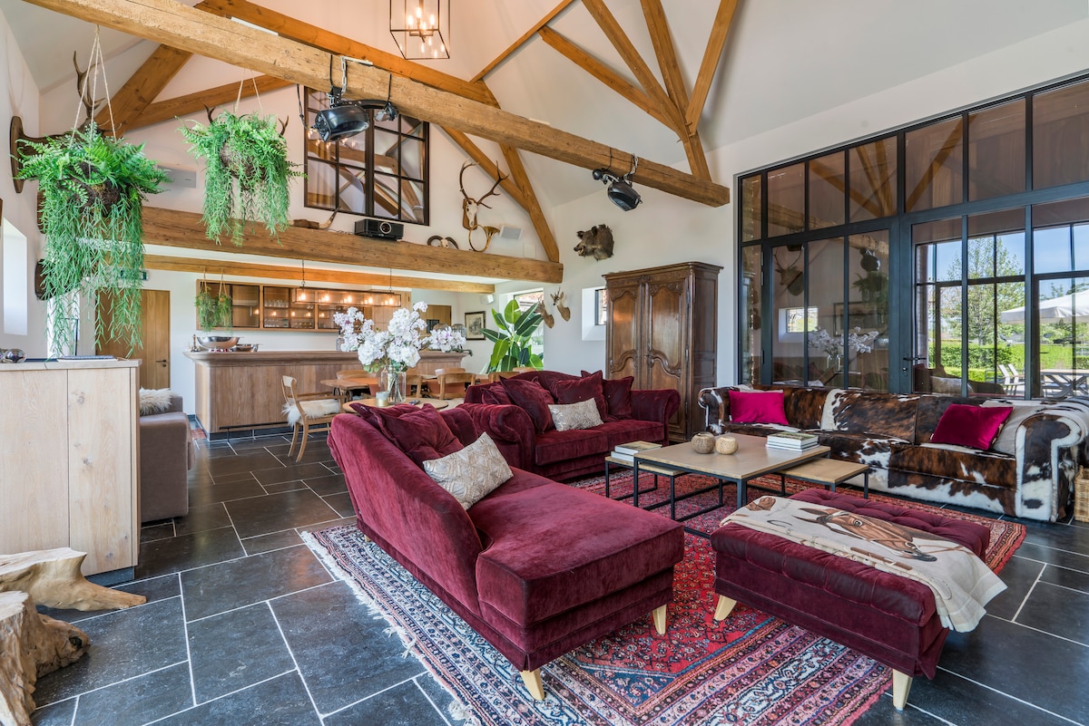 池塘旁的豪华自然房屋,配备健身设施